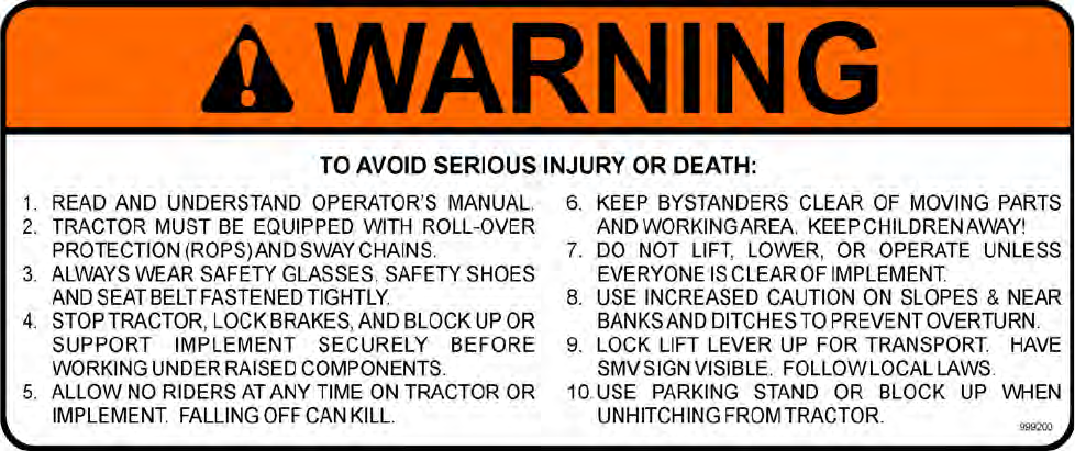 8. Hitch only to the drawbar and hitch points recommended by the tractor manufacturer.