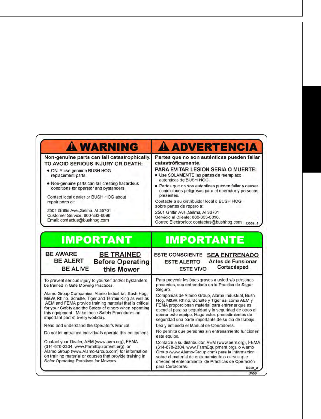 WRITING AND SIGNED BY BUSH HOG’S SERVICE MANAGER, 2501 GRIFFIN AVE., SELMA, ALABAMA