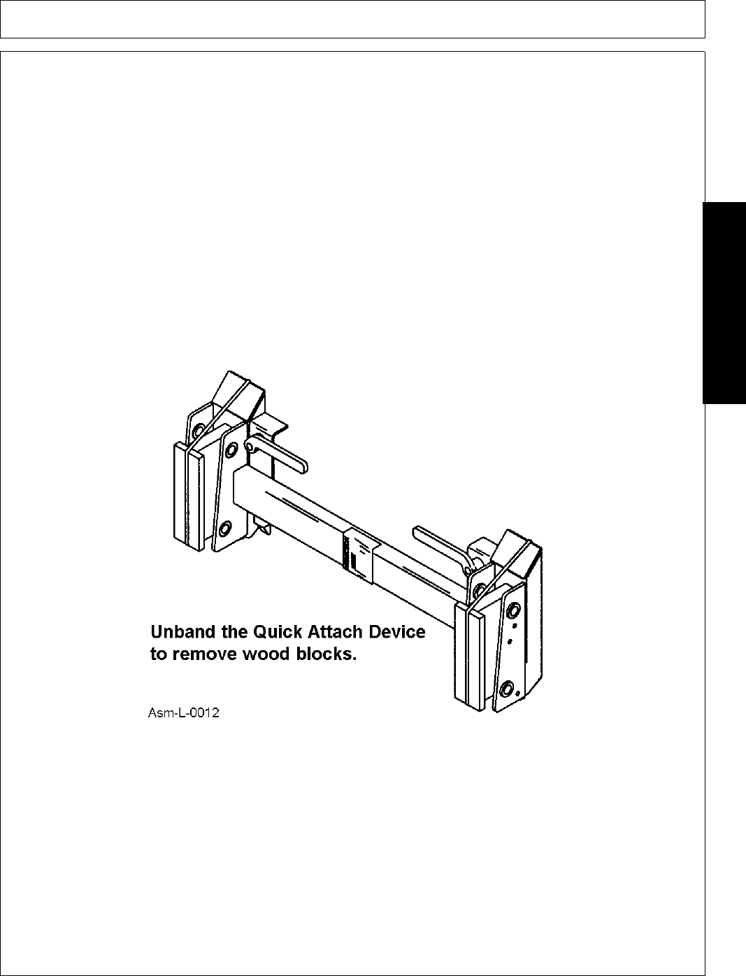 - 1. Fasten quick attach device to lower boom arms and bucket tilt cylinders using 1” x 4-3/8” anti-rotation pins, 3/8” x 3/4” shoulder bolts, and 3/8” lock nuts (supplied with loader). Figure Asm-L-0014.