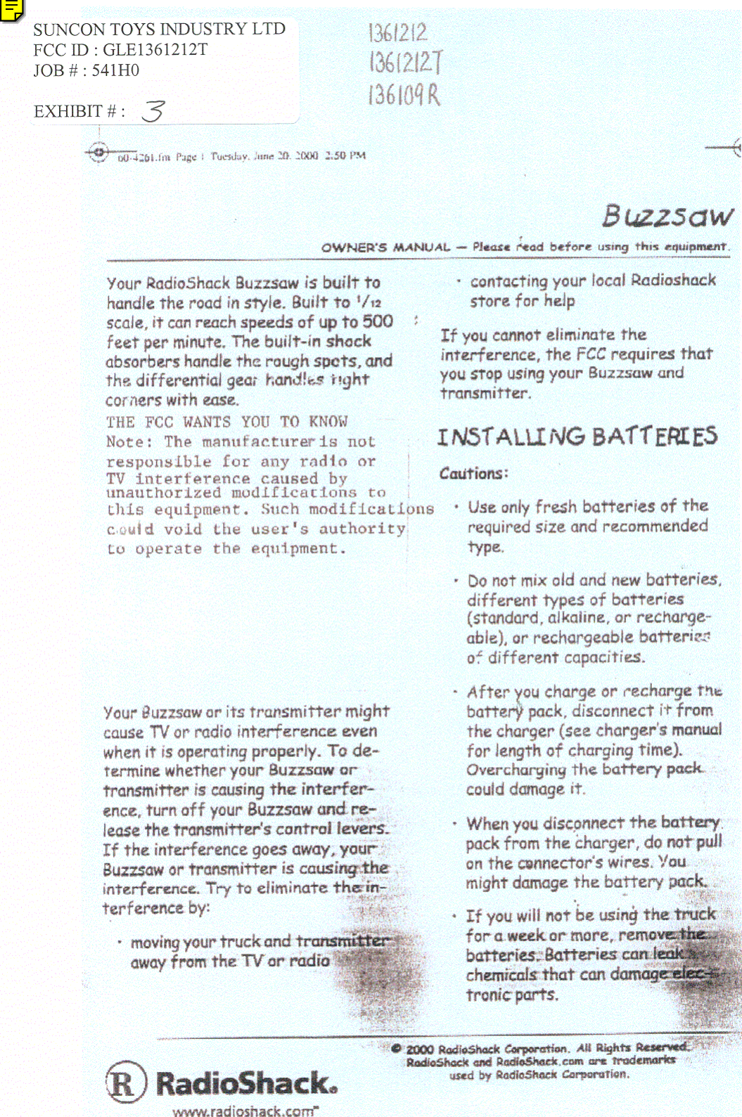 Suncon Toys Industry 1361212 27 MHz Remote Control Transmitter User Manual users manual