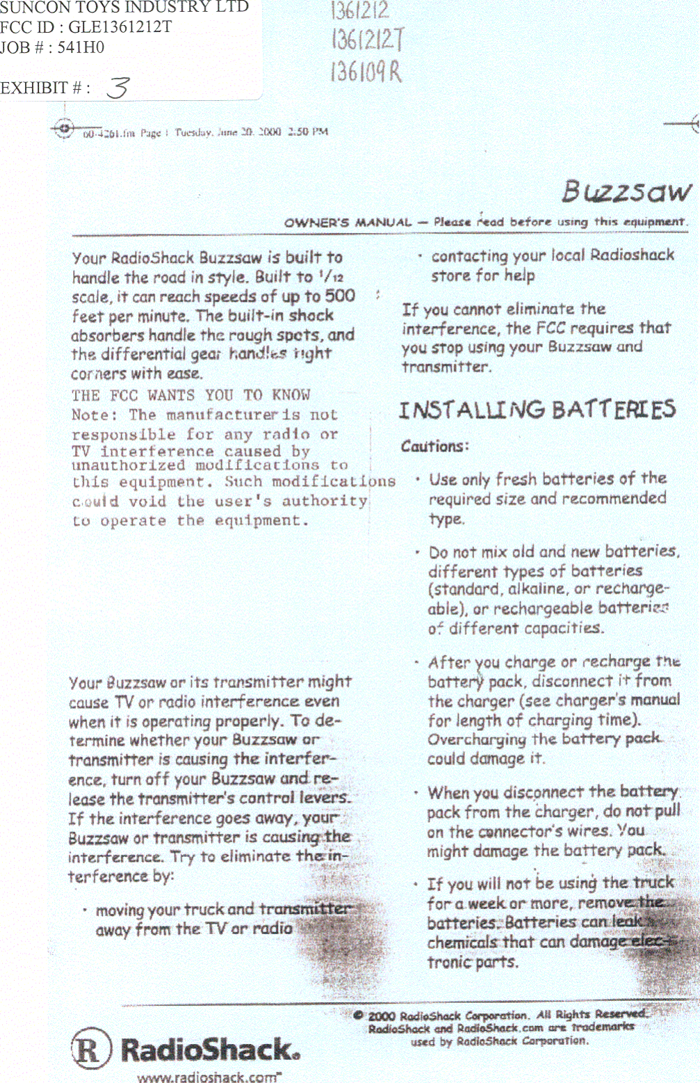 Suncon Toys Industry 1361212T 49 MHz Remote Control Transmitter User Manual users manual