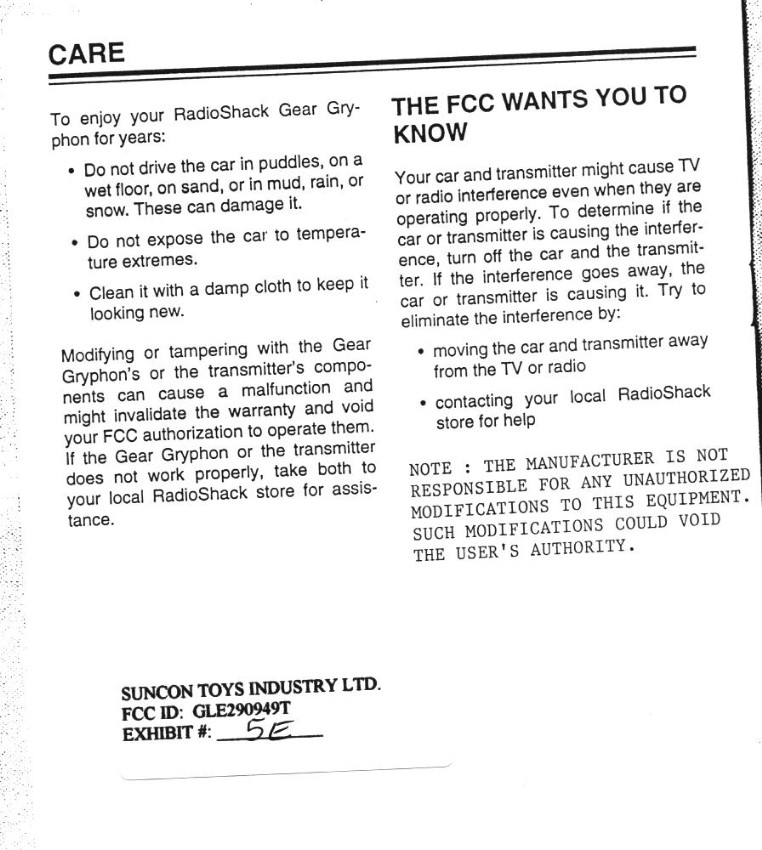 Suncon Toys Industry Ltd 49 MHz R/C TRANSMITTER USERS MANUAL PAGE FIVE