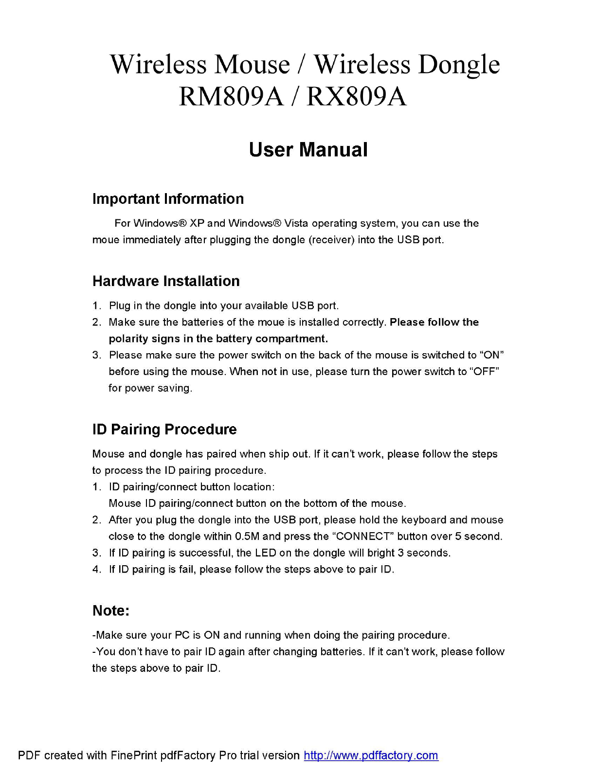 Sunrex Technology RM809A Wireless Mouse User Manual