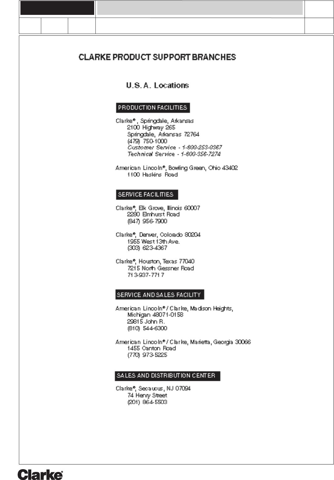 Highway 265, Springdale, ´Arkansas 72764, for the nearest authorized Clarke repair location. Only these locations are