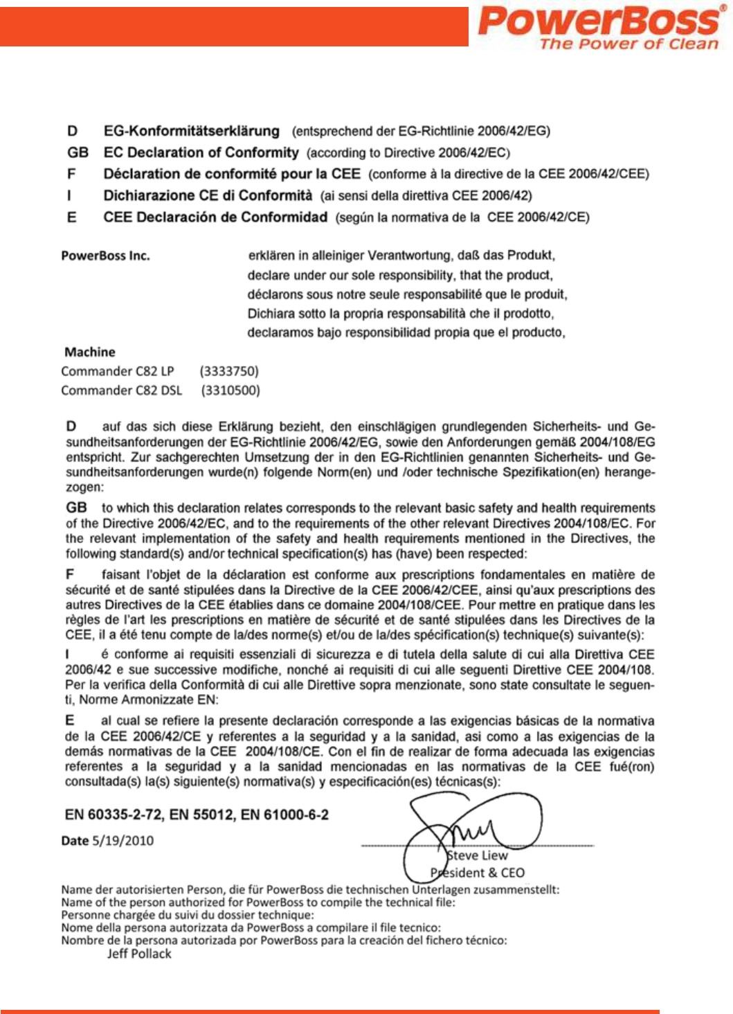 • The machine is maintained with PowerBoss Inc. supplied or equivalent parts.