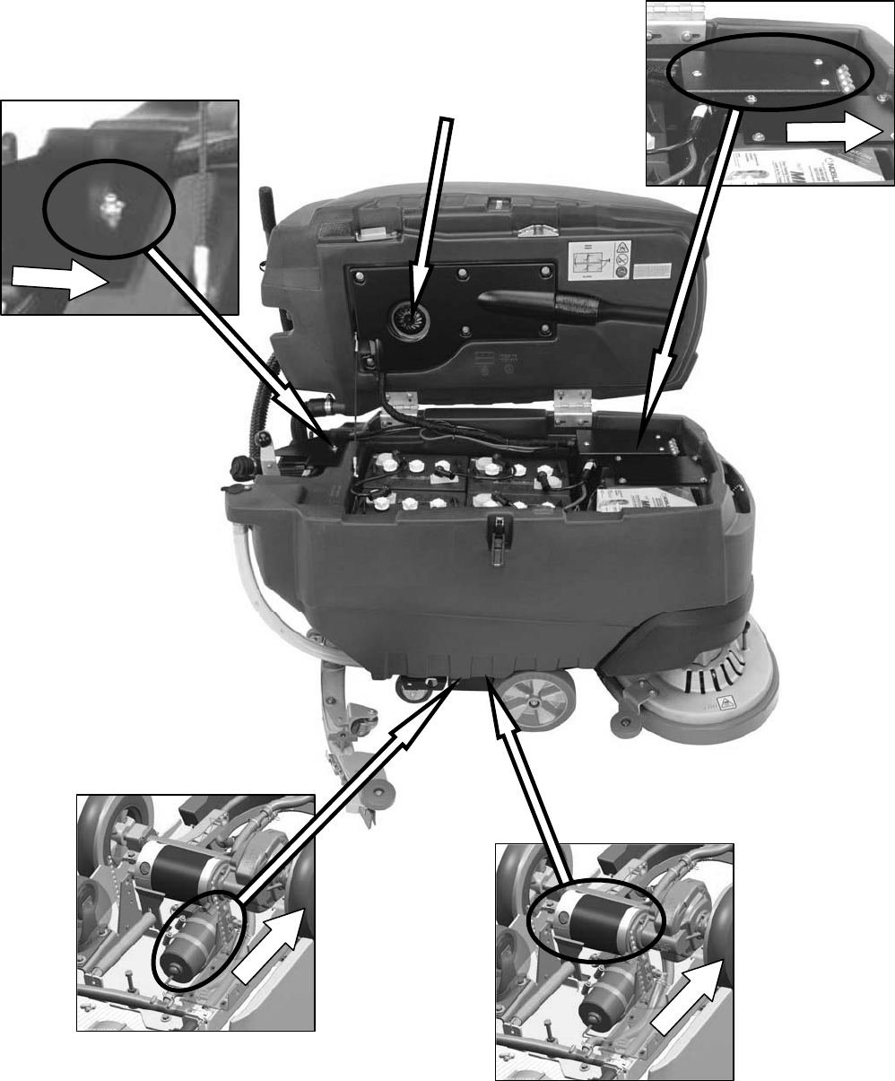 CONDITIONS: Key ON, Scrub Head lowered for cleaning, propel engaged