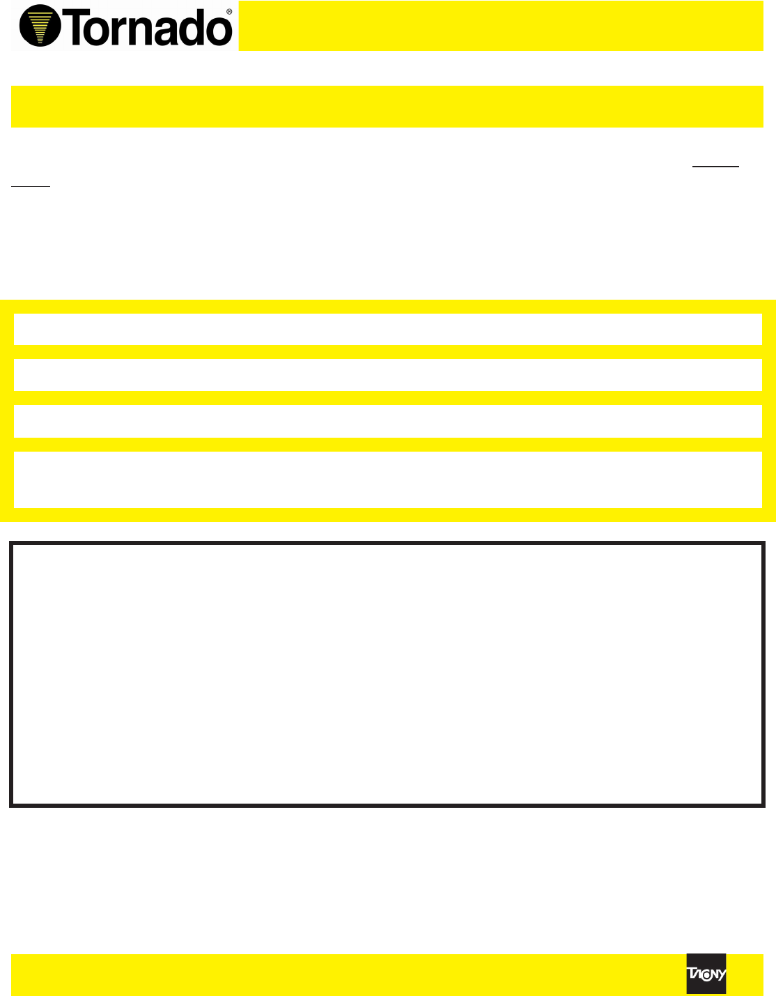 Tornado Technical Service Department. Tornado sales and service representatives are not authorized to waive or
