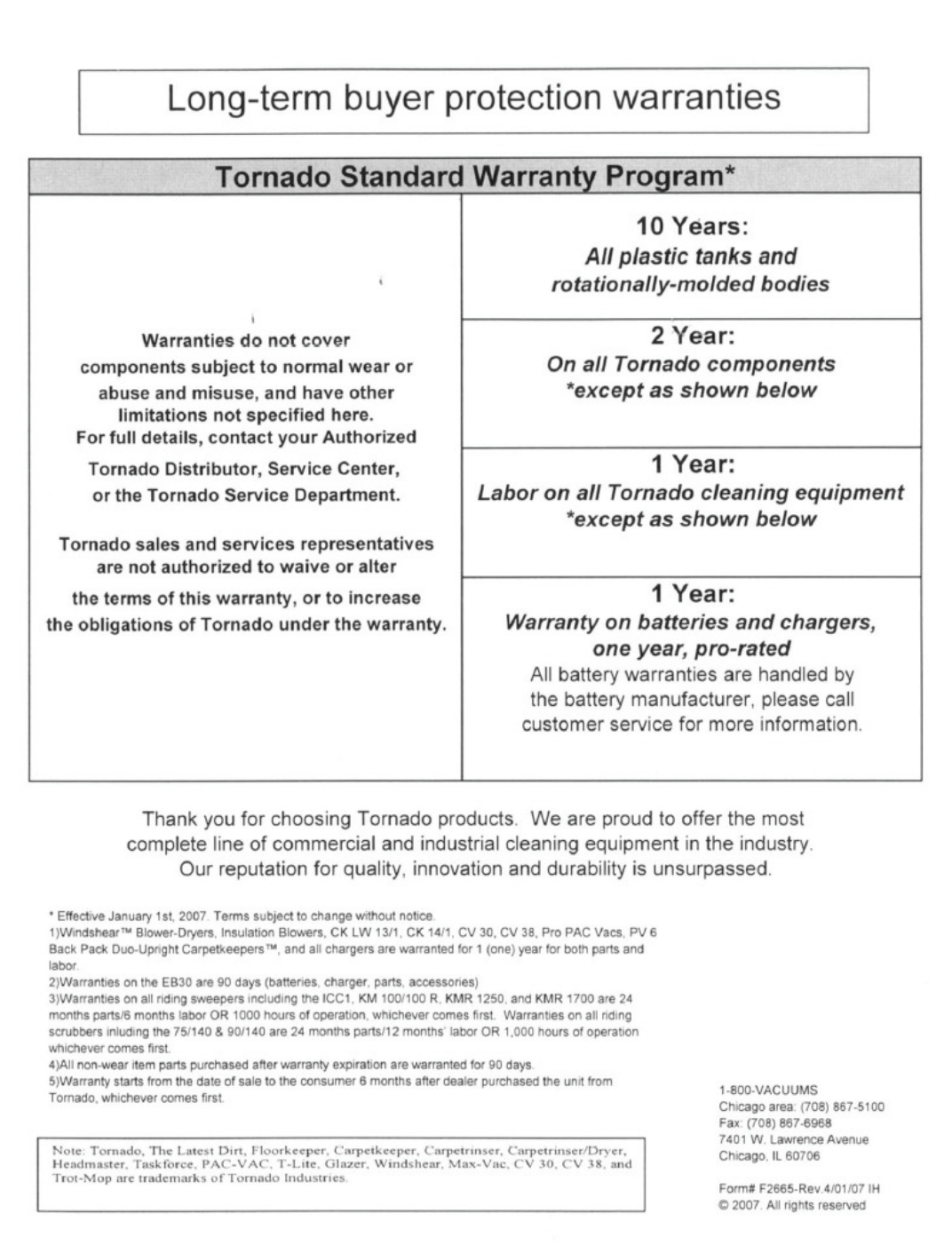 obtenir tous les détails, veuillez communiquer avec votre distributeur Tornado autorisé, le centre d’entretien autorisé ou le département de