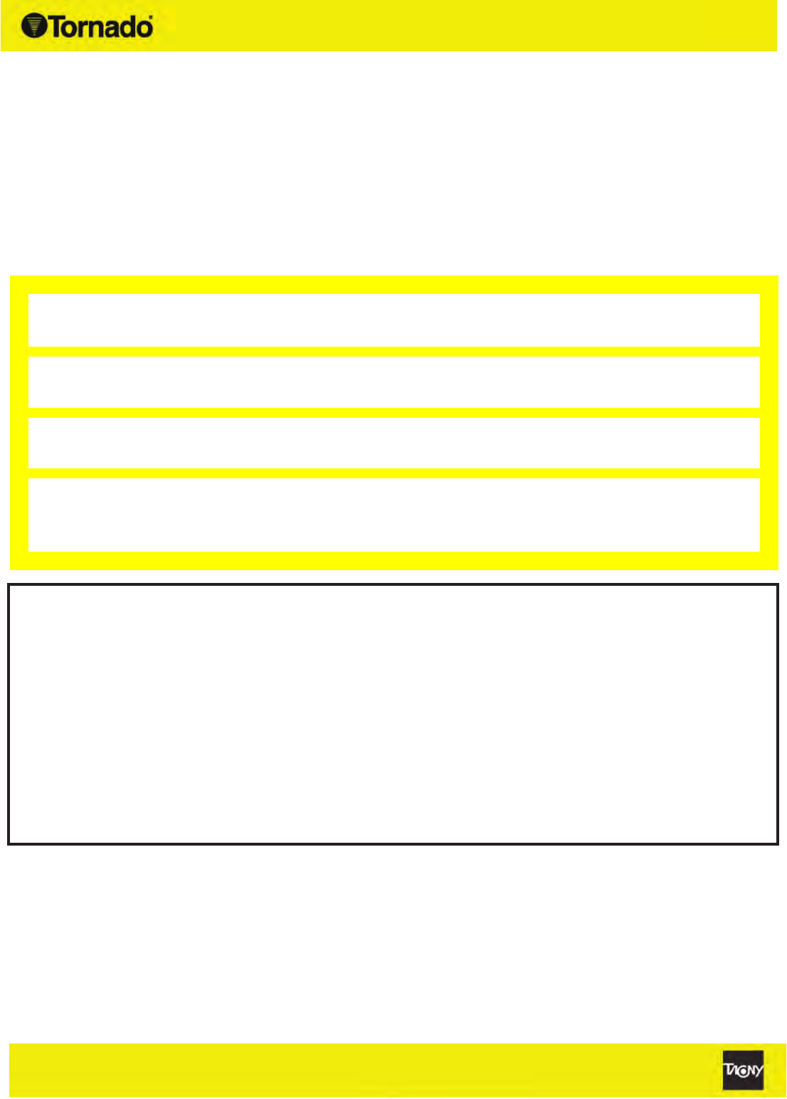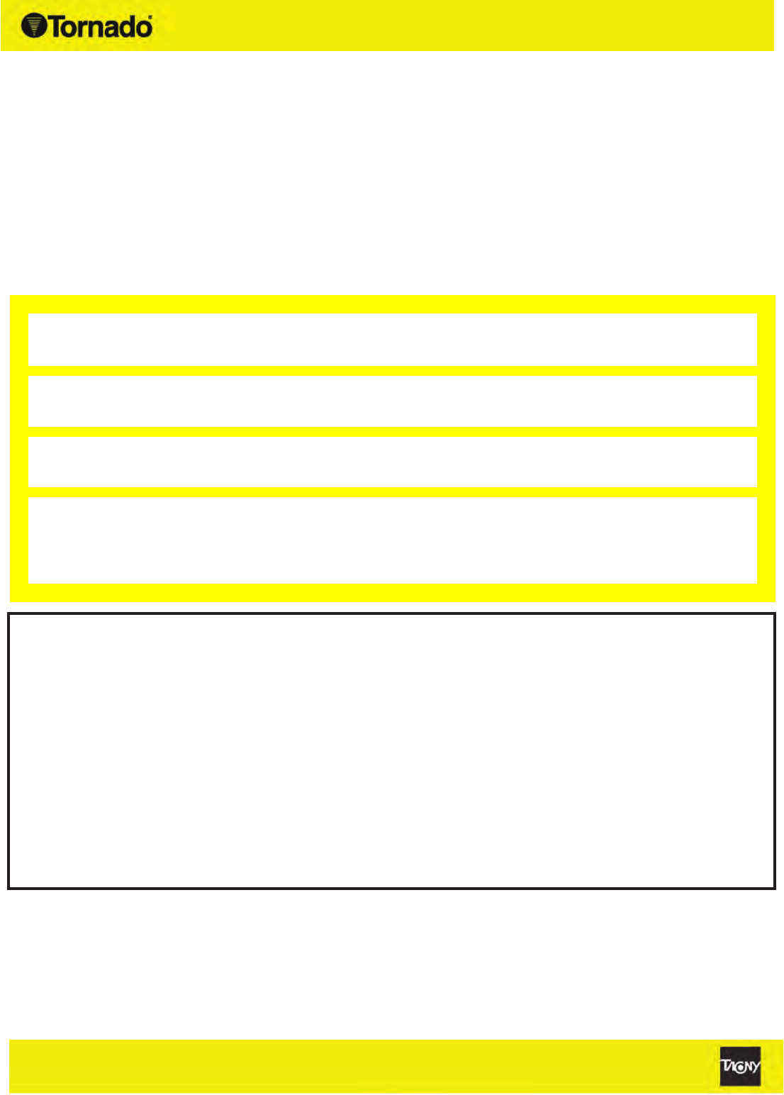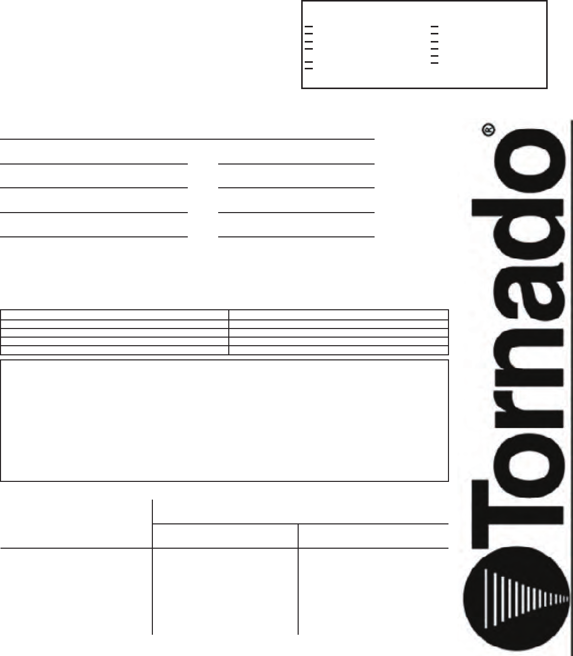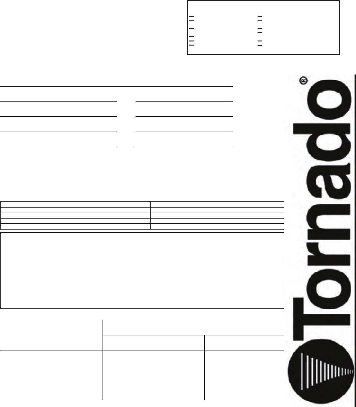 Tornado Technical Service Department. Tornado sales and service representatives are not authorized to waive or