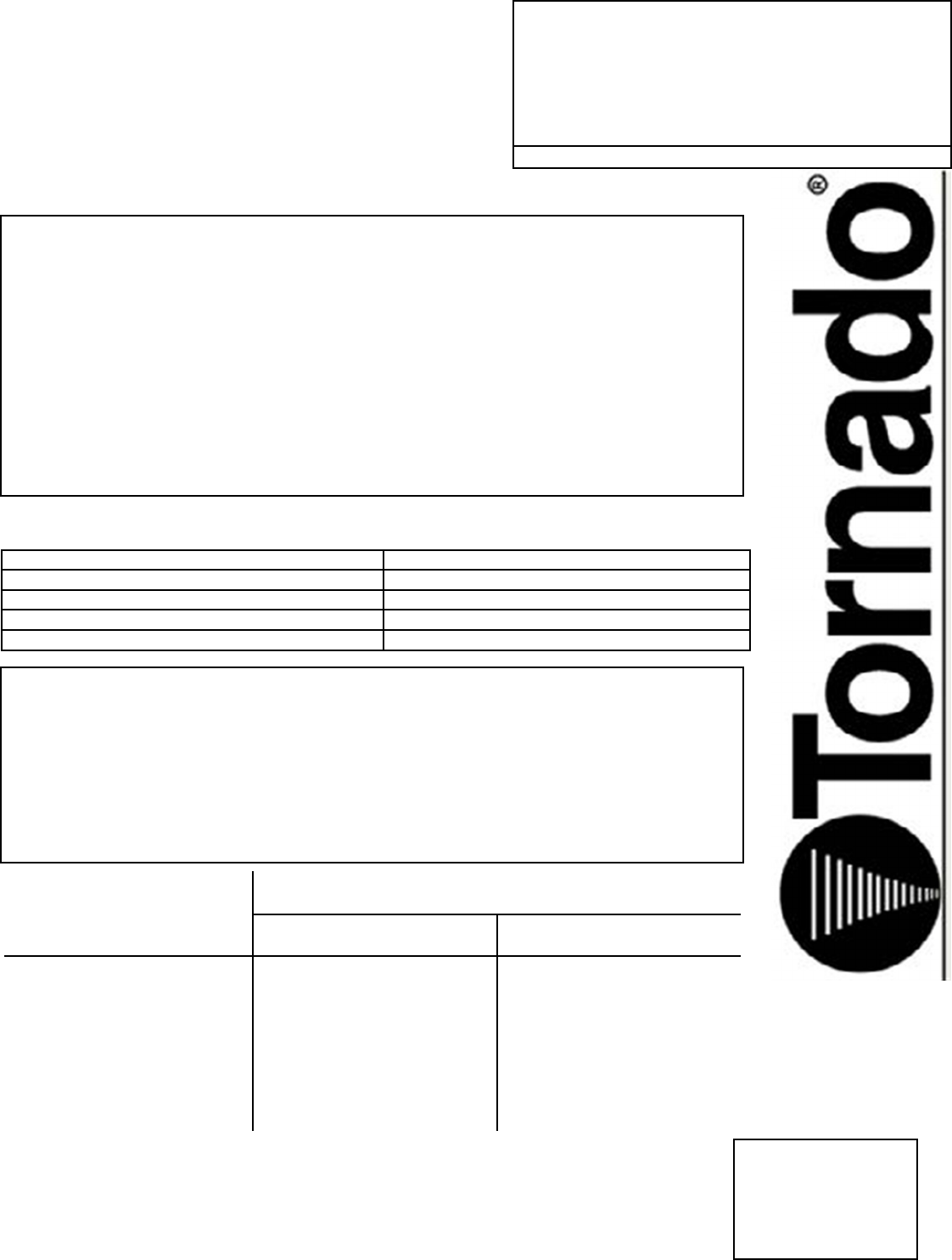 rized Tornado Distributor, Service Center, or the Tornado Technical Service Department. Tornado