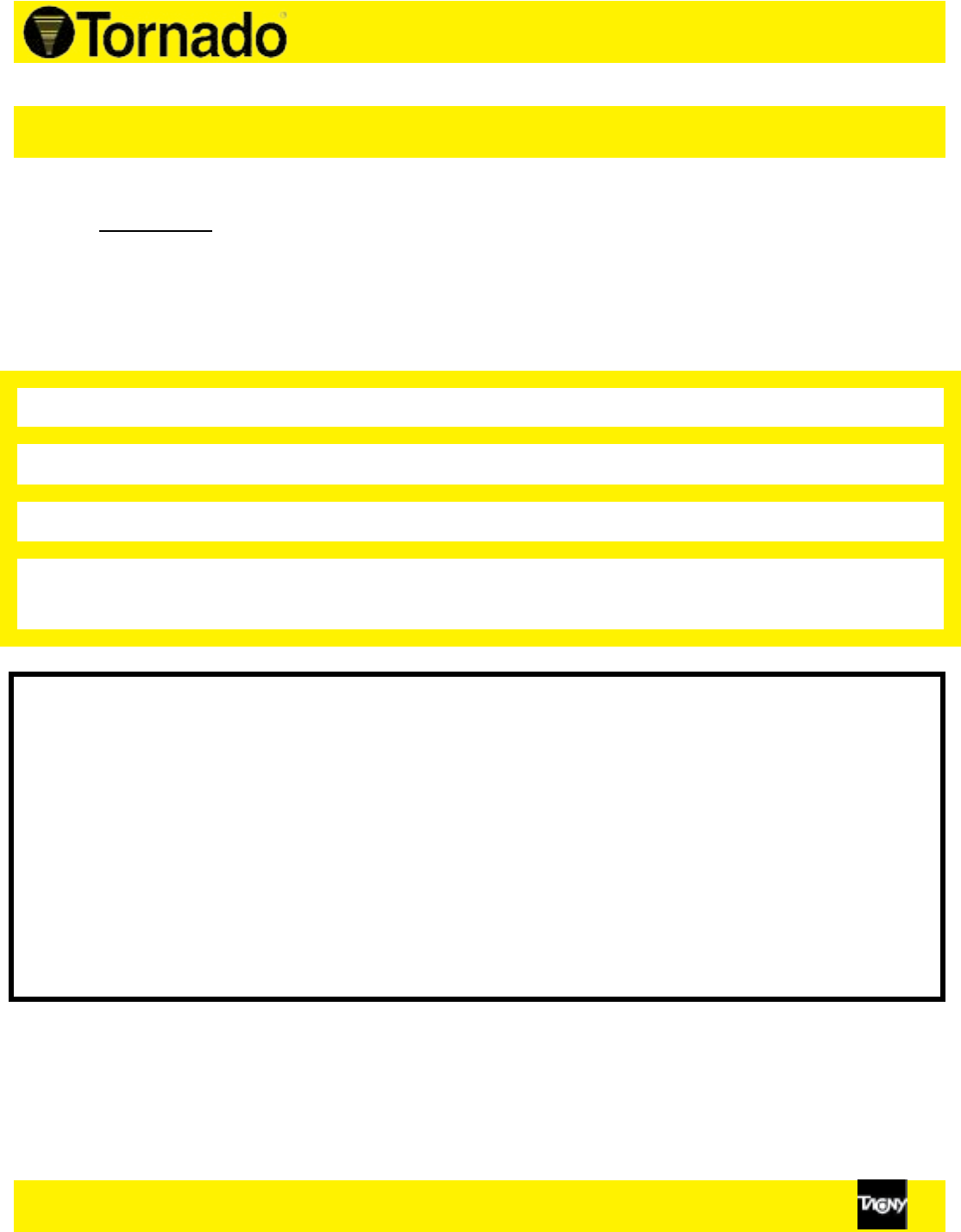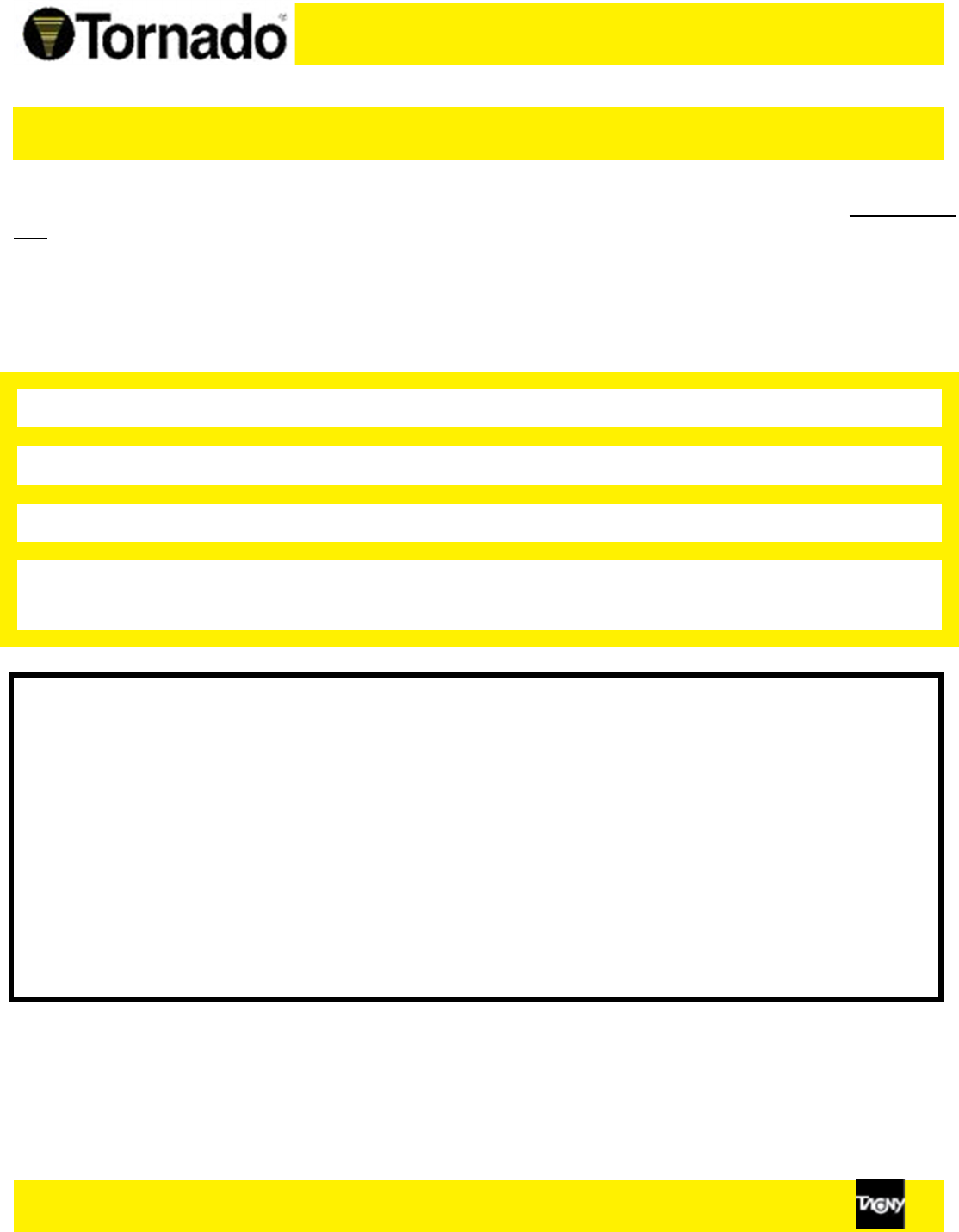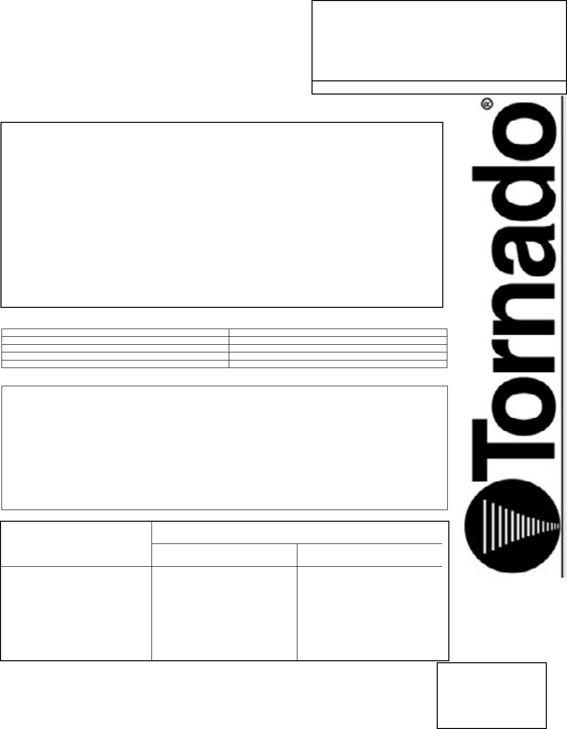 purchase. Contact Tornado for any warranty inquiries.