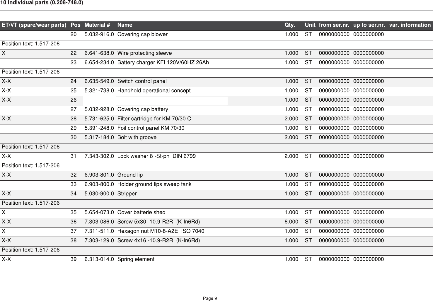 ET/VT (spare/wear parts) Pos Material # Name Qty. Unit from ser.nr. up to ser.nr. Footnote text