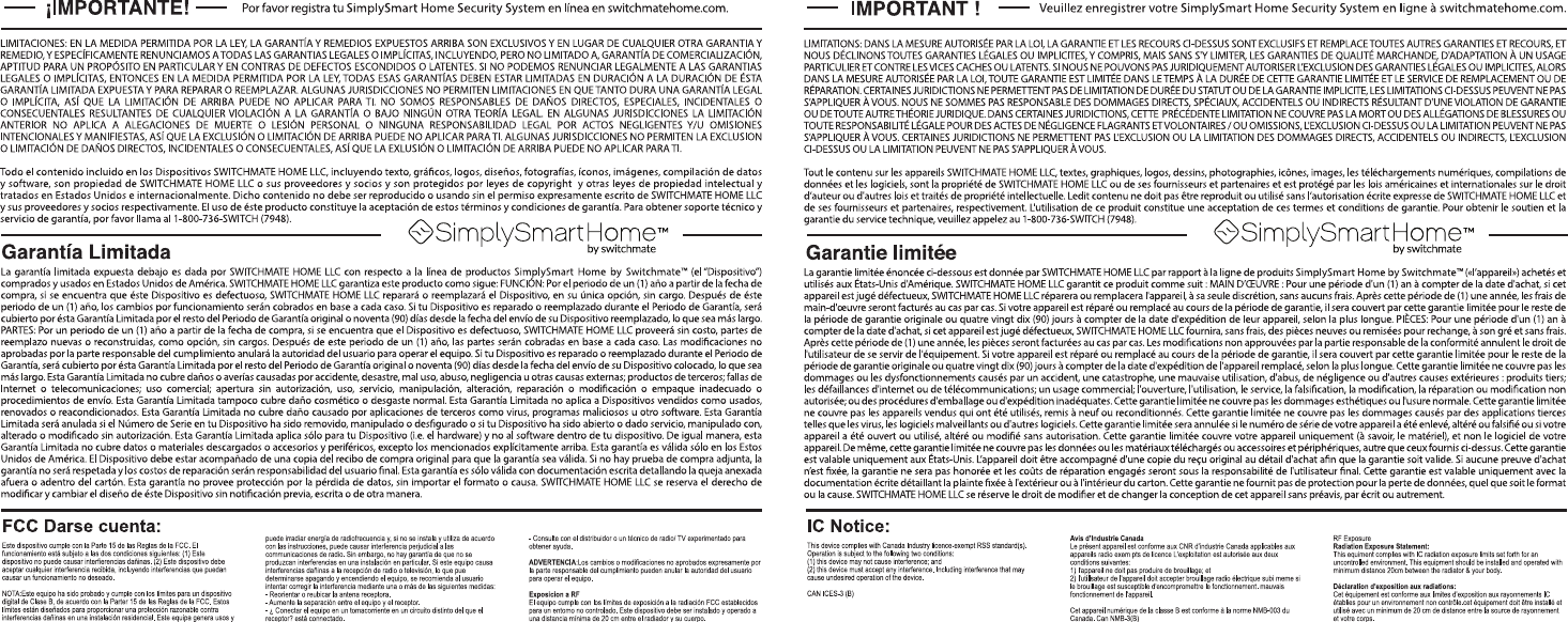 Warranty CardAA Lithium batteriesCoin cell battery (CR2050) Switchmate Home, LLCThis device complies with part 15 of  the FCC Rules. Operation is subject to the following two  conditions:  (1)  This  device  may  not  cause  harmful  interference,  and  (2)  this  device must accept any interference received, including interference  that may cause  undesired operation.SimplySmartHome ®
