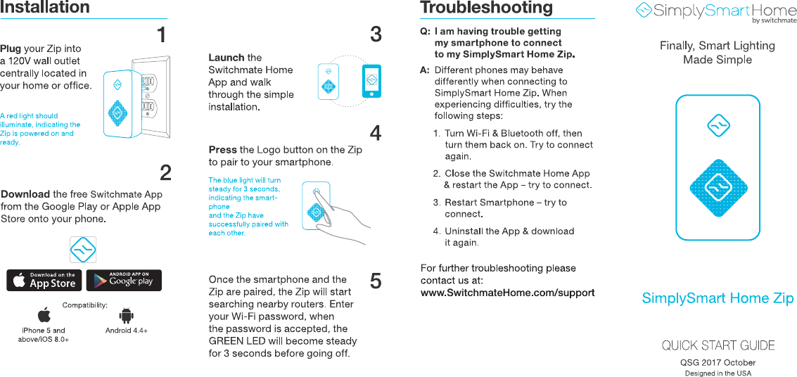 SWITCHMATE HOME ZSCSM0013 Zip-Siren BLE-Wi-Fi Bridge User Manual SMV001 QSG ZIP siren English o