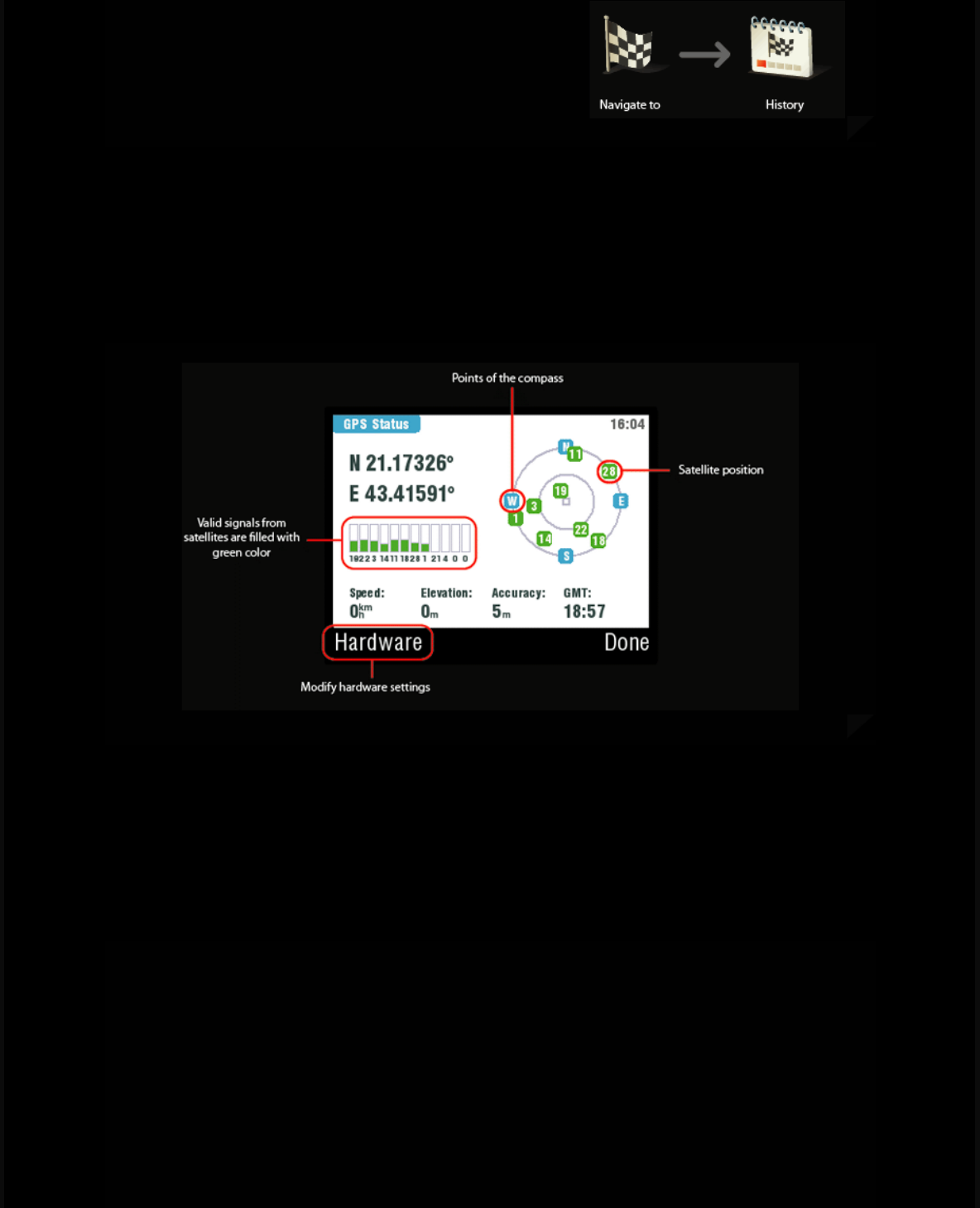 For more information about GPS status and proper Hardware settings go to Useful functions and subchapters GPS