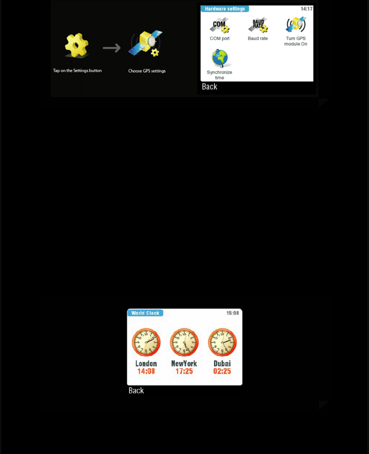 using Memorize position function | GPS status | Hardware settings | World clock