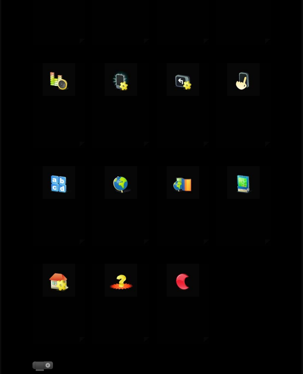 night colors, swtich from 3D view to view from top, backlight settings, rotate display, set different languages, set
