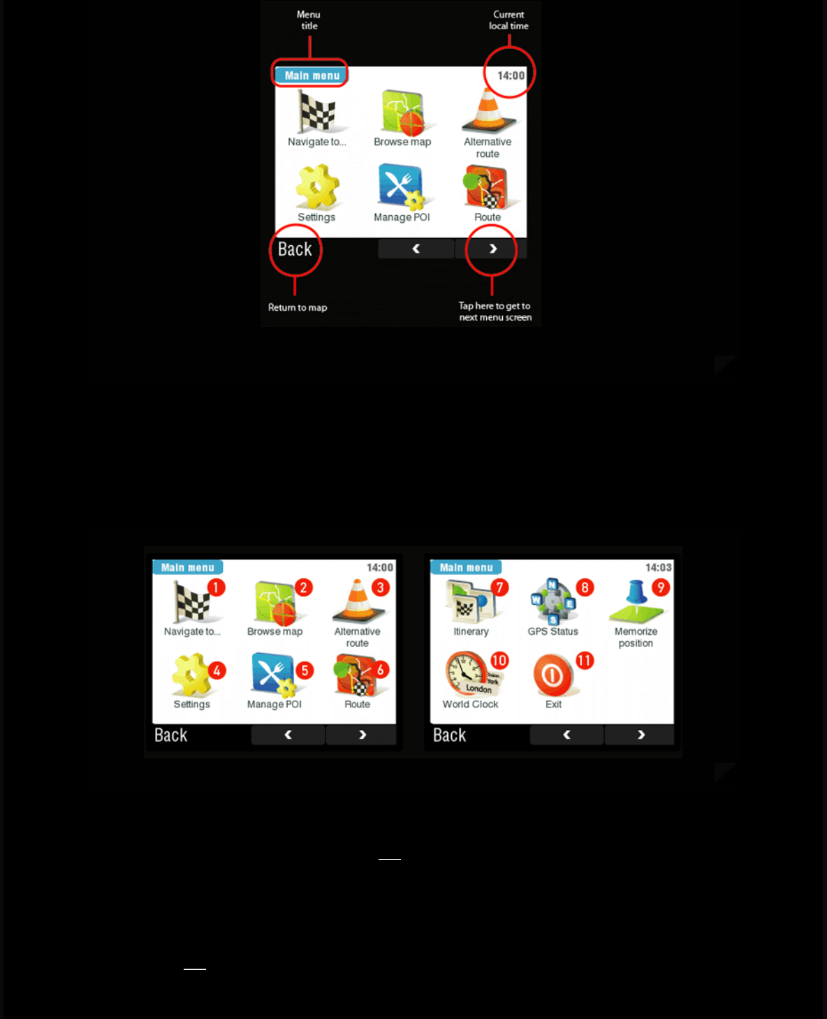 GPS position. Navigate to button is the vey first icon on the main menu screen, by clicking on it you'll get access to