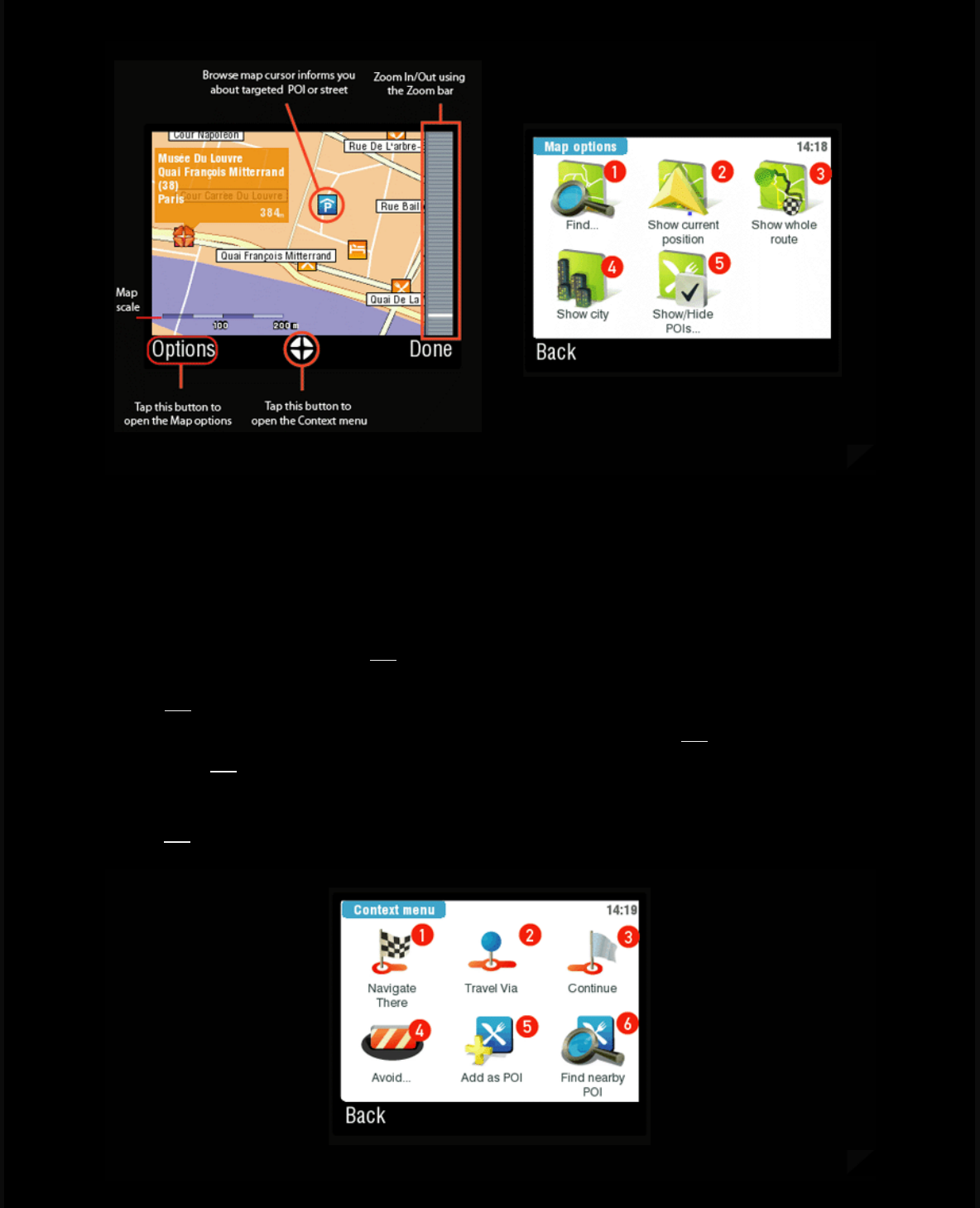 functions in the options menu like find position on the map, show current position, show nearby points of interest