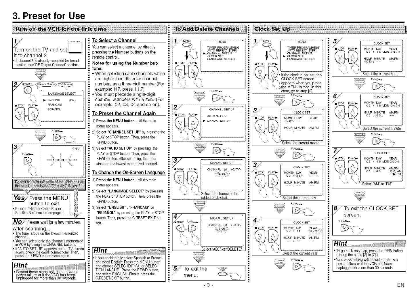 2) At the TV, select channel 3 or 4 (the same channel as i Follow the steps 1) to 2) above. Then, play back a tape.