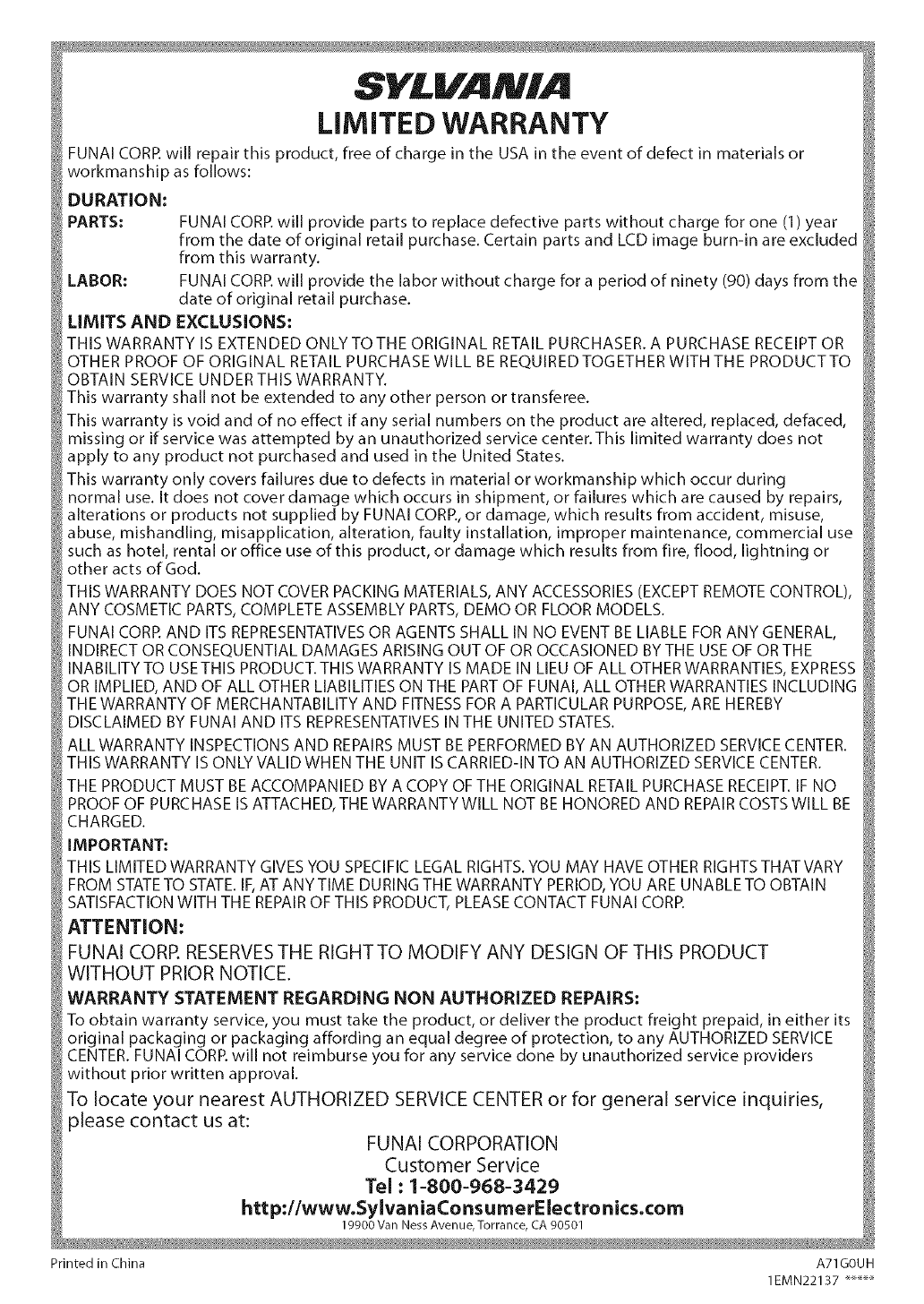 SATISFACTION WITH THE REPAIR OF THIS PRODUCT, PLEASECONTACT FUNAI CORP.