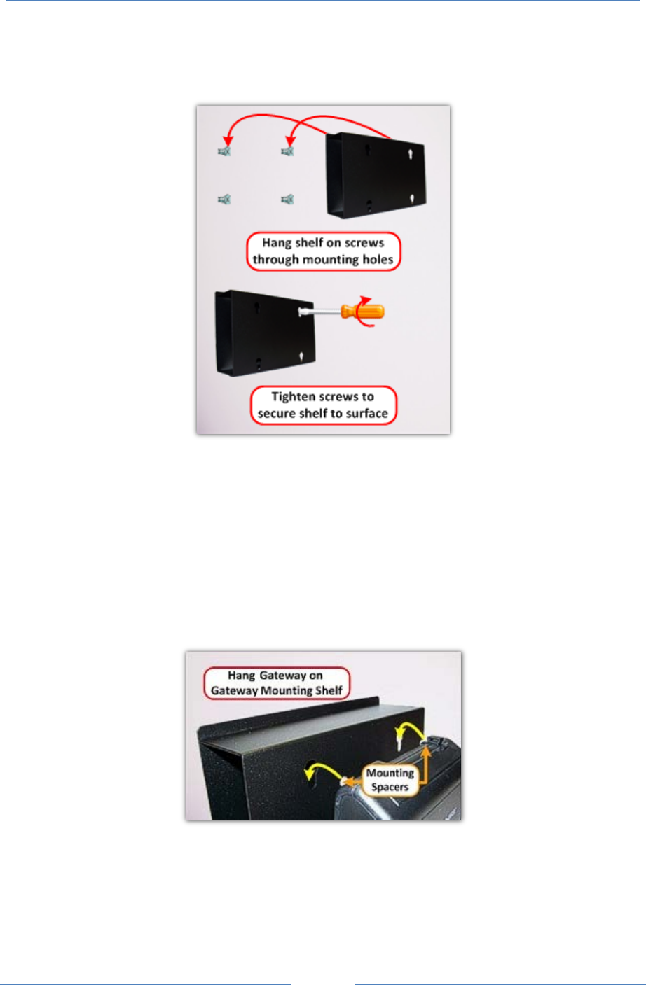 7. Insert the Gateway’s mounting spacers in the shelf’s front mounting holes and slide the Gateway