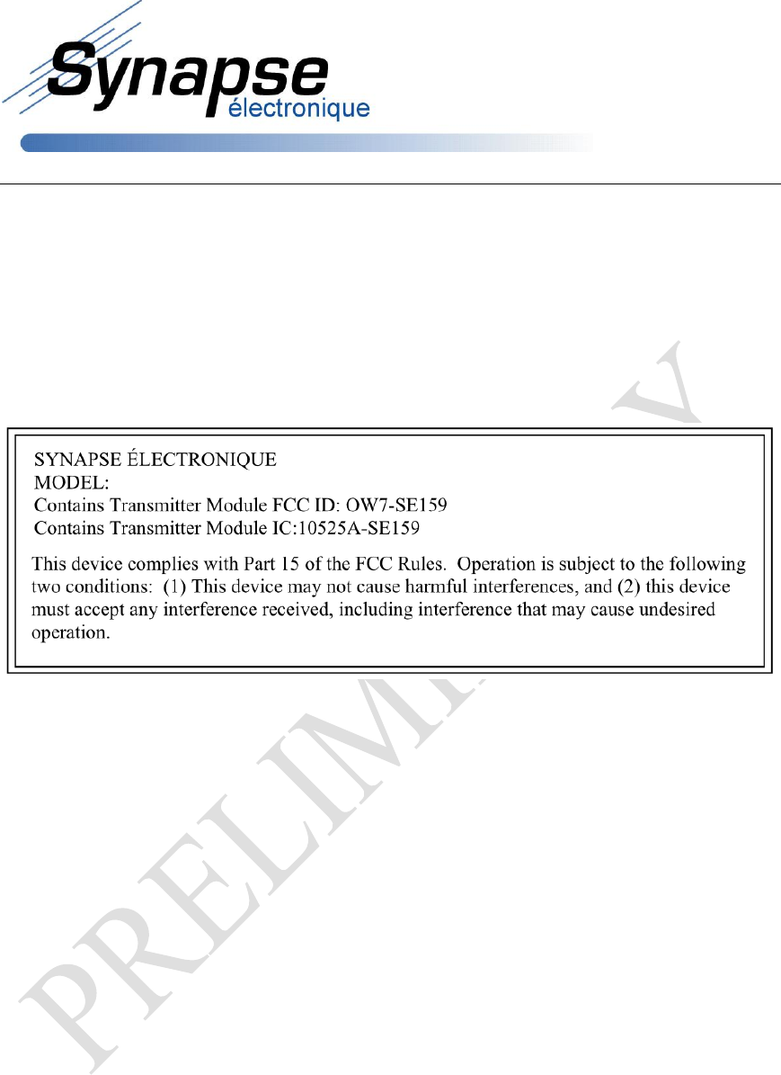 Synapse Electronique SE159 Wireless communication module User Manual Technolink Systems inc