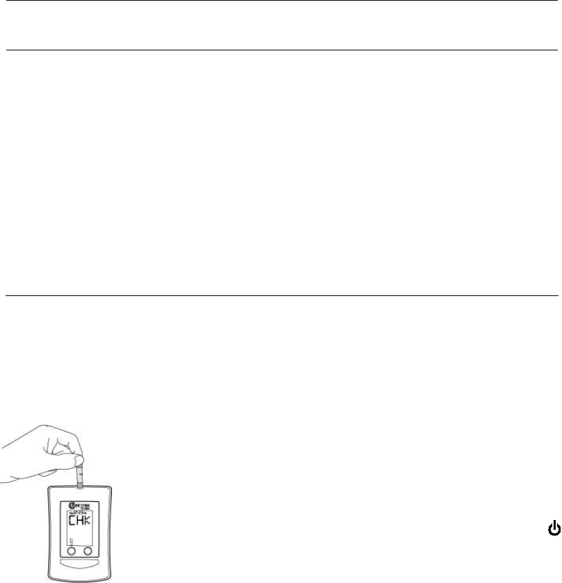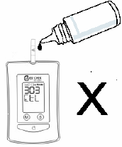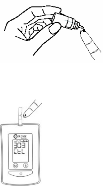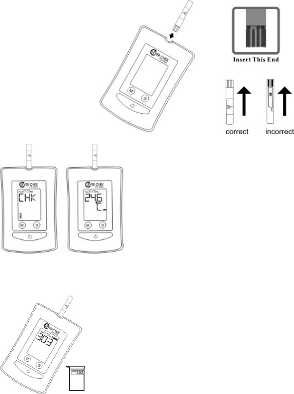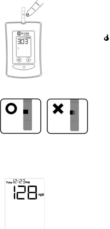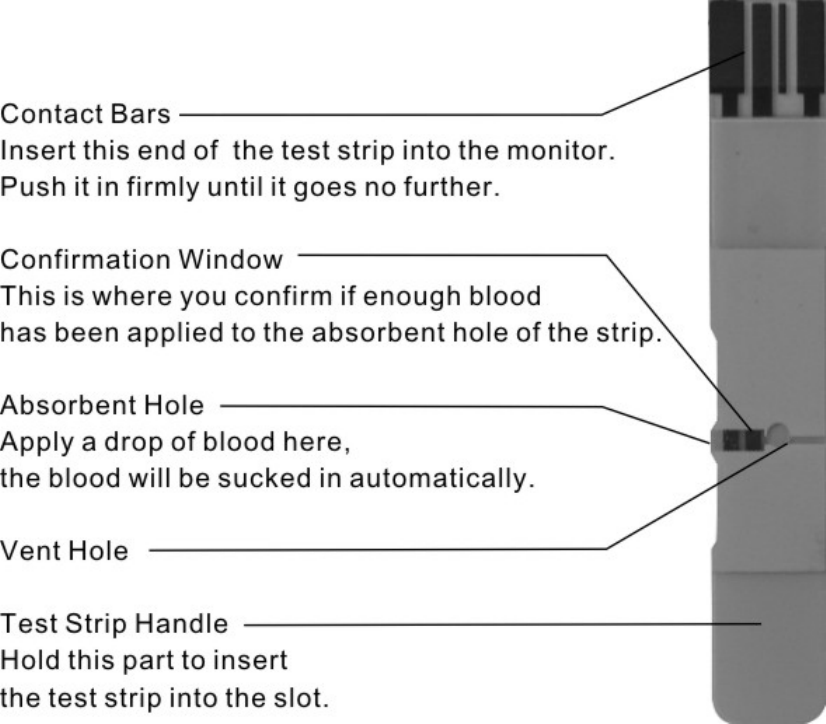 the absorbent hole of the test strip draws a small amount of blood into the