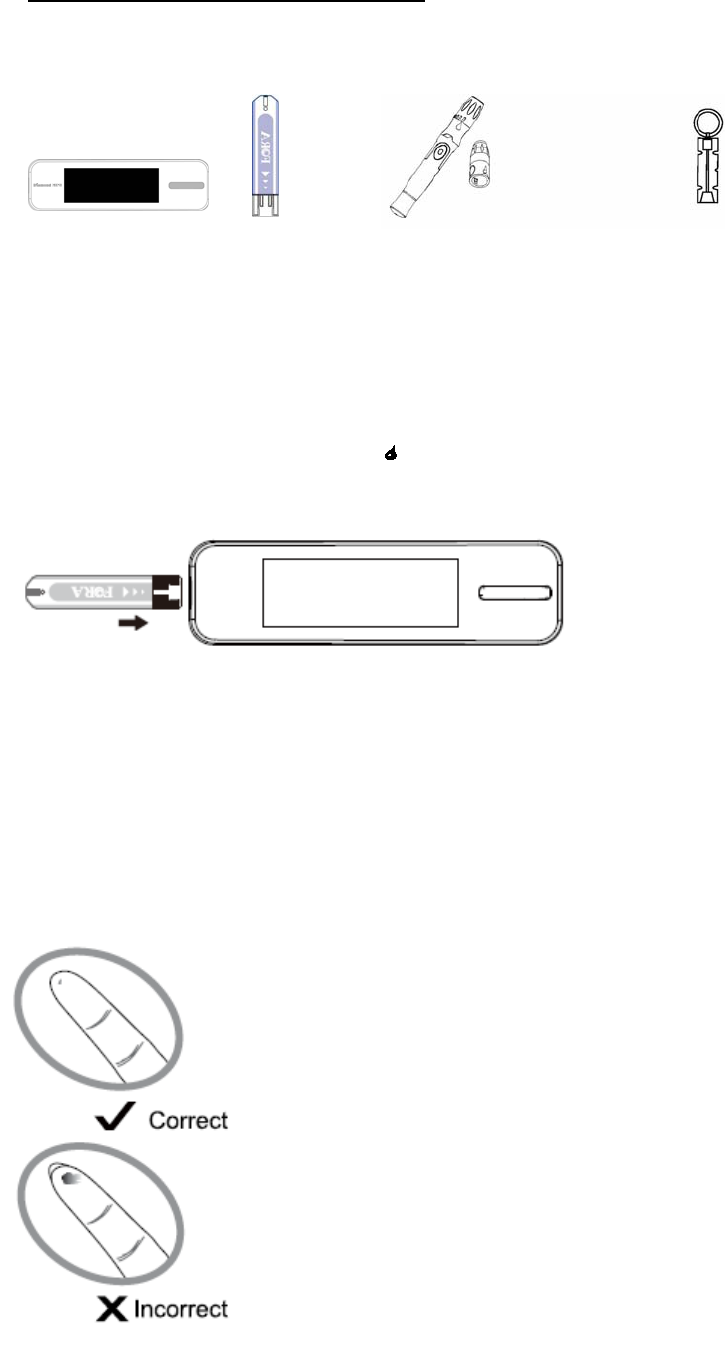 items such as the battery cover, batteries, test strips, lancets and vial caps