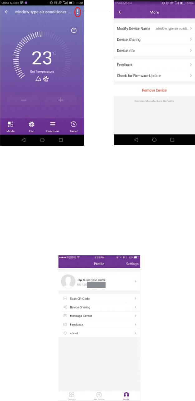 as Modify Device Name, Device Sharing, Device information, Feedback,