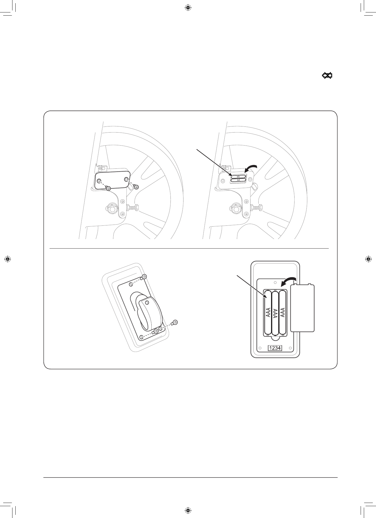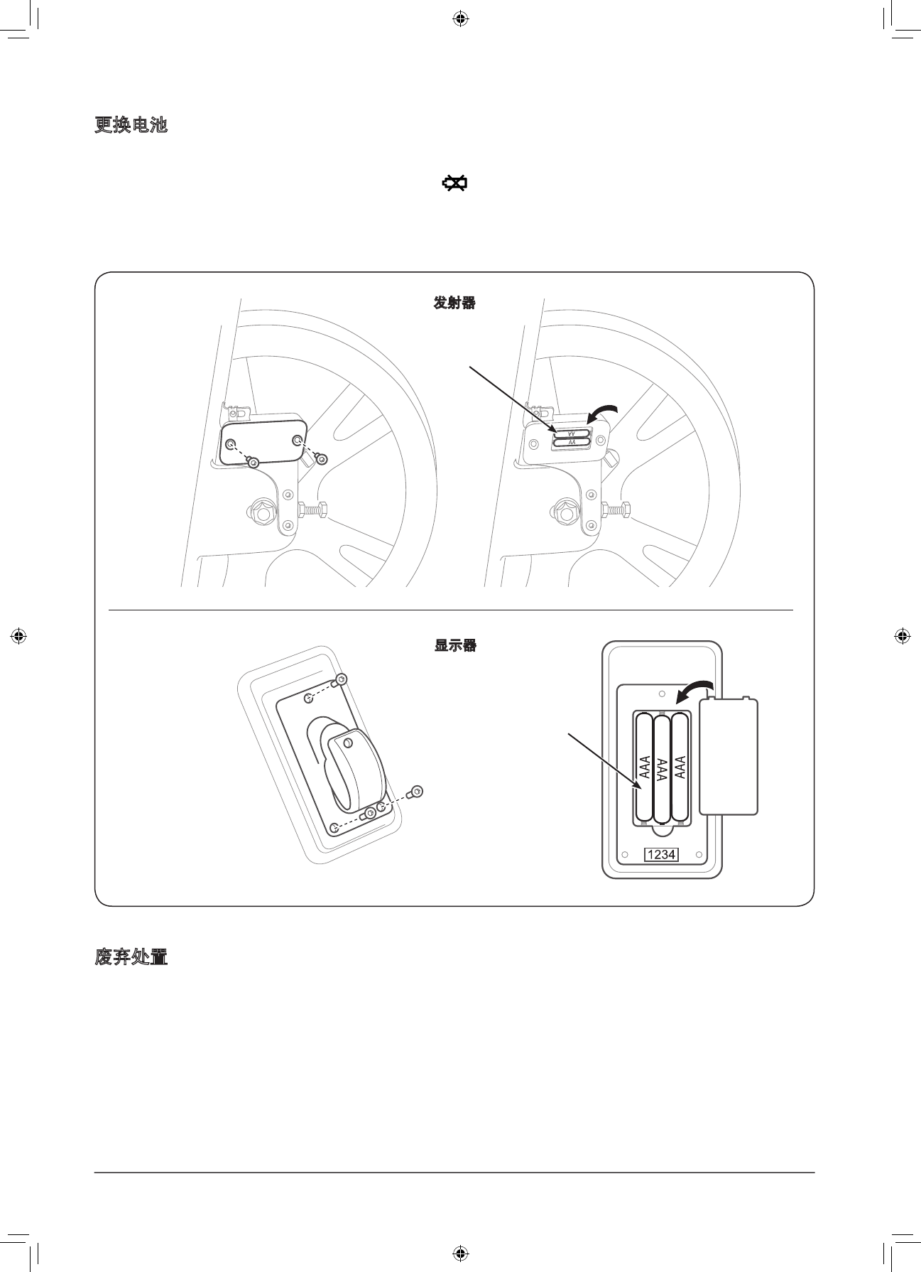 如需更换发射器和显示器电池,拧松盖板螺丝,按指示方向放入新电池,然后再将盖板螺丝拧紧。