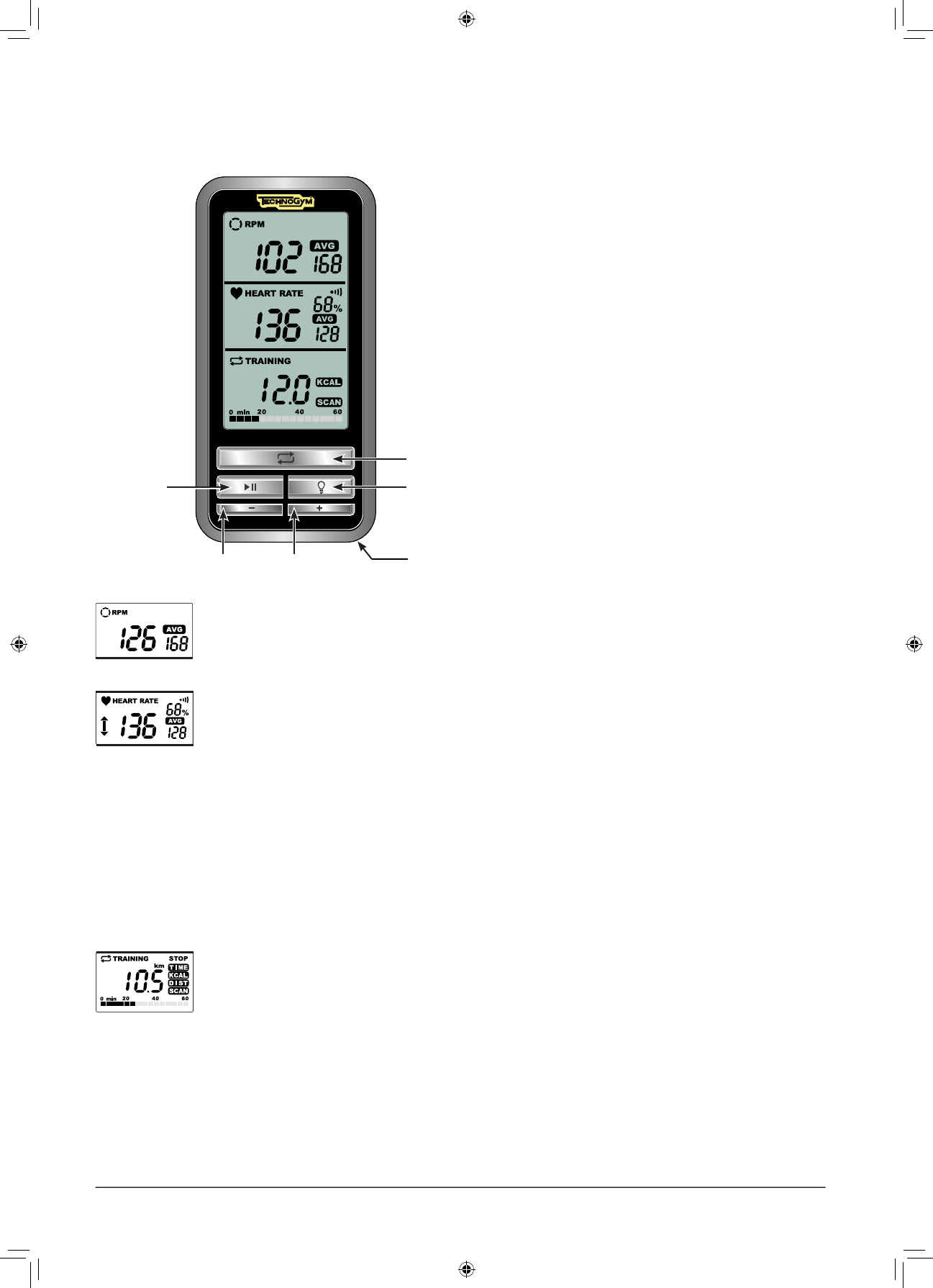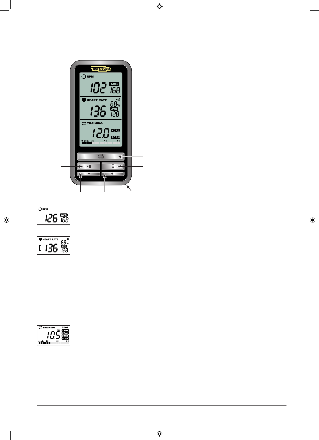 la dernière case de l’écran. En cas de sélection de l’option SCAN, les valeurs de temps, kilocalories et distance