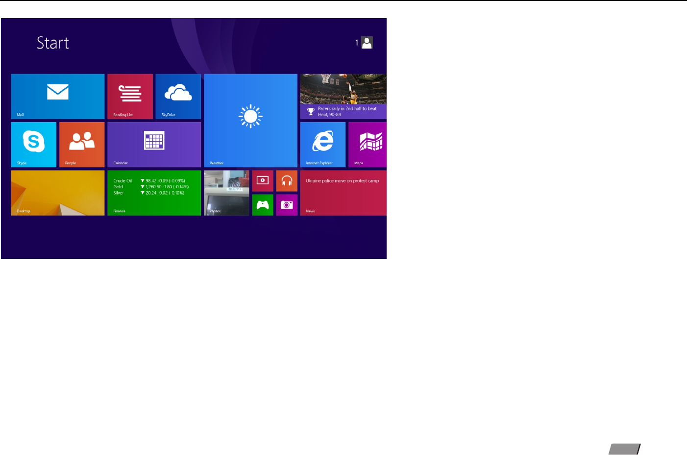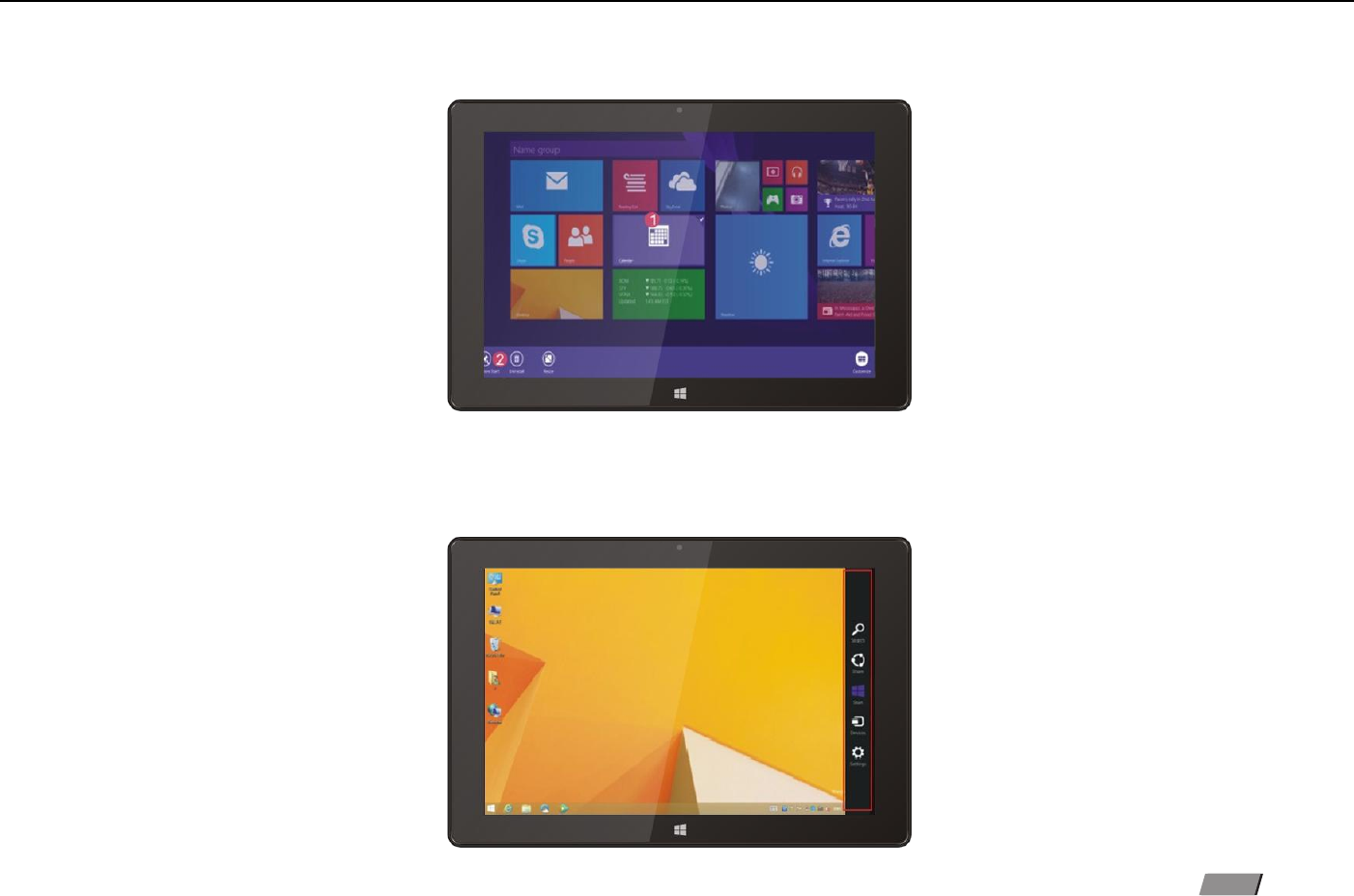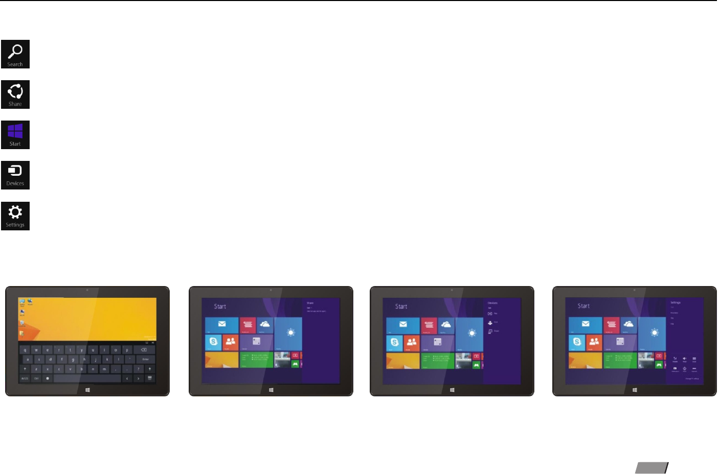 Slide it to the left from the right side of the screen to start Charm menu column, including: Start, Device, Setup, Share, and Search