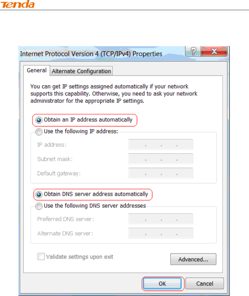 ⑦ Select Obtain an IP address automatically and click OK.