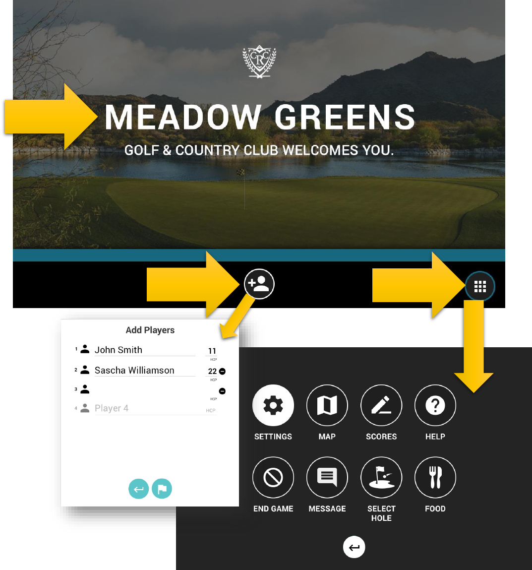 The user has access to a menu with options to enter their name and golf handicap for score keeping and other options.
