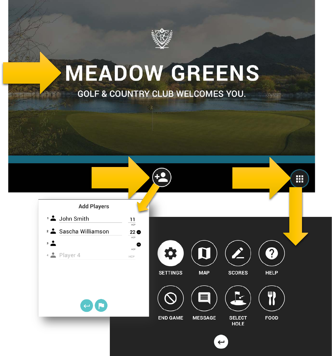 The user has access to a menu with options to enter their name and golf handicap for score keeping and other options.