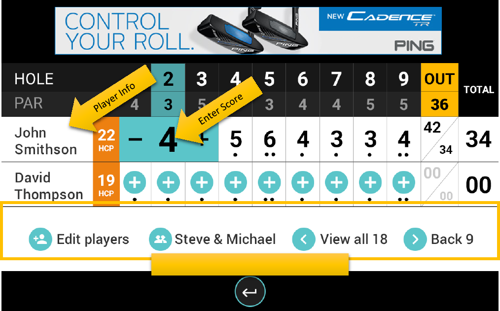 Once a game is started, players can enter hole-by-hole scores. Handicap stroke holes are automatically allocated and
