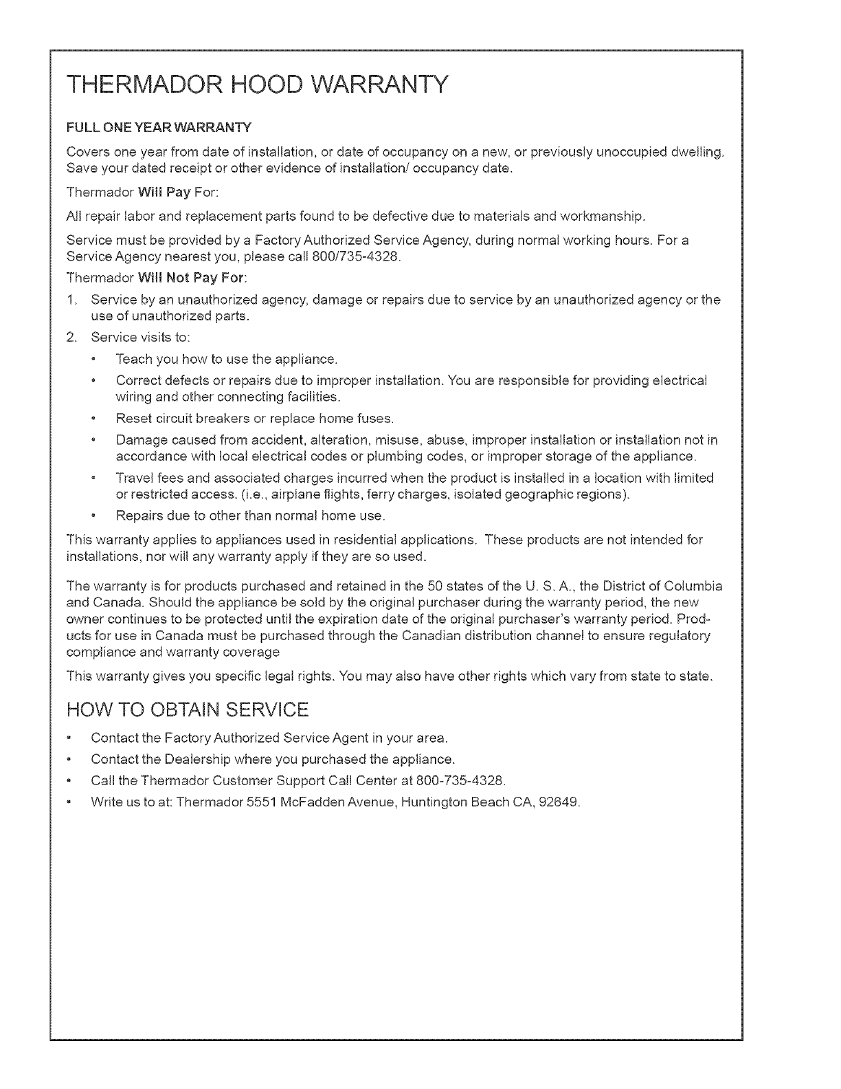THERMADOR HOOD WARRANTY