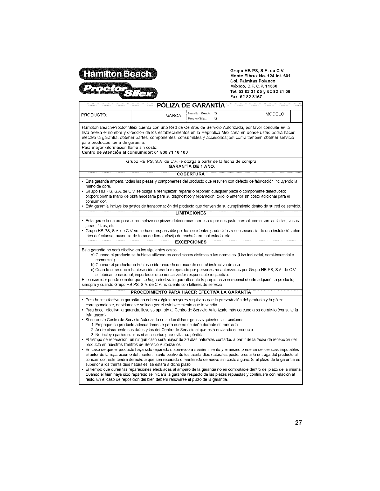 Grupo HB PS, S.A. de C.V. se obliga a reemptazar, reparar o reponer, caaIquier pieza o componente defectuoso;