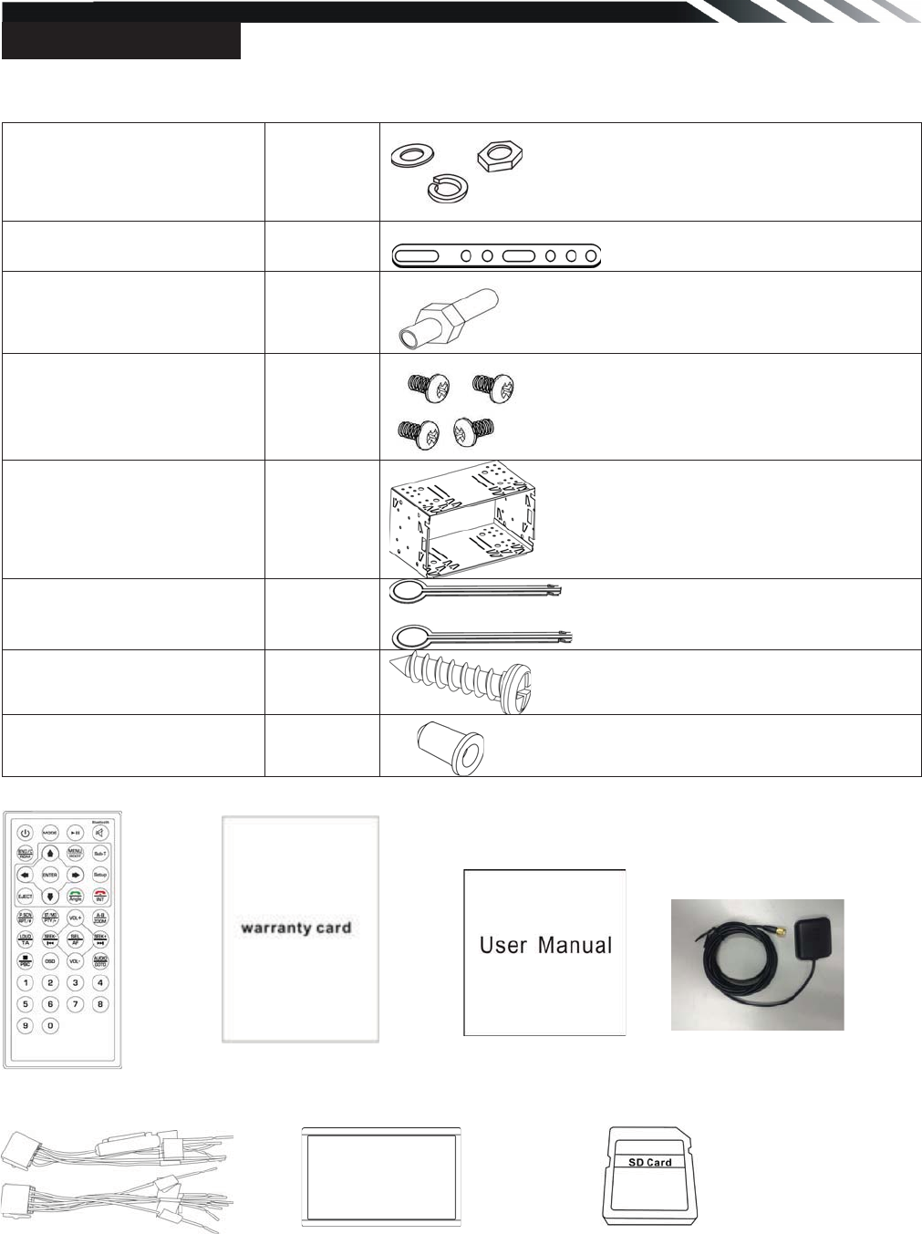 Package contains the following accessories for installation and operation of the unit.