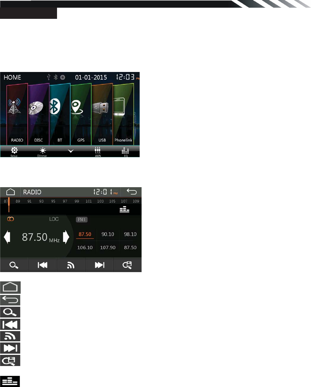 Frequency range(U.S.A Area): 87.5 – 107.9MHz(Step 100KHz)