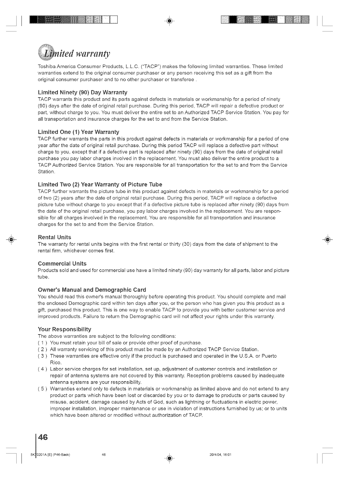 Toshiba America Consumer Products, LLC. ("TACP") makes the following limited warranties. These limited