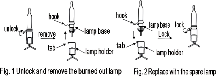 c) Insert the spare LED lamp into the lampholder in correct direction and lock the hook of lamp base by pushing lock down into the tab as shown in Fig.2.
