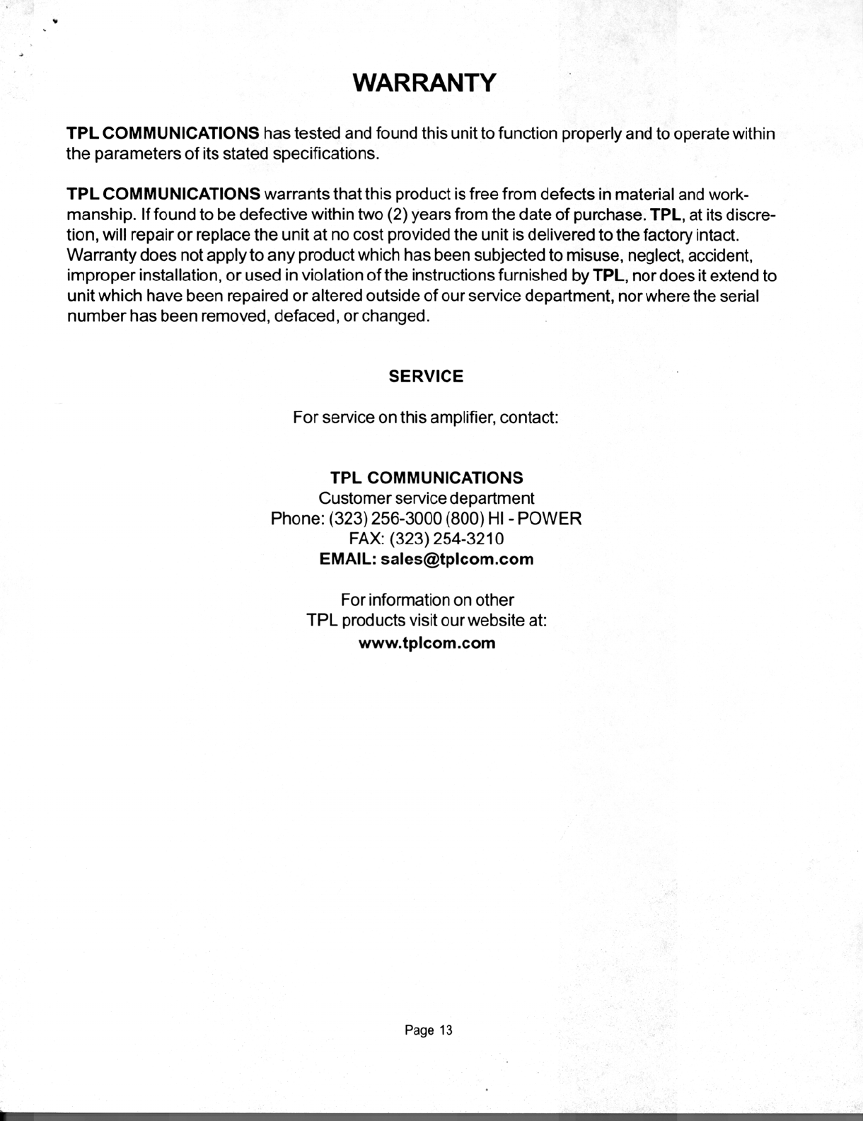 TPL Communications 3-2BH-AIR RF Power Amplifier User Manual Manual