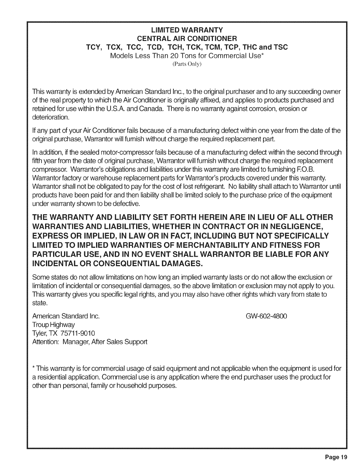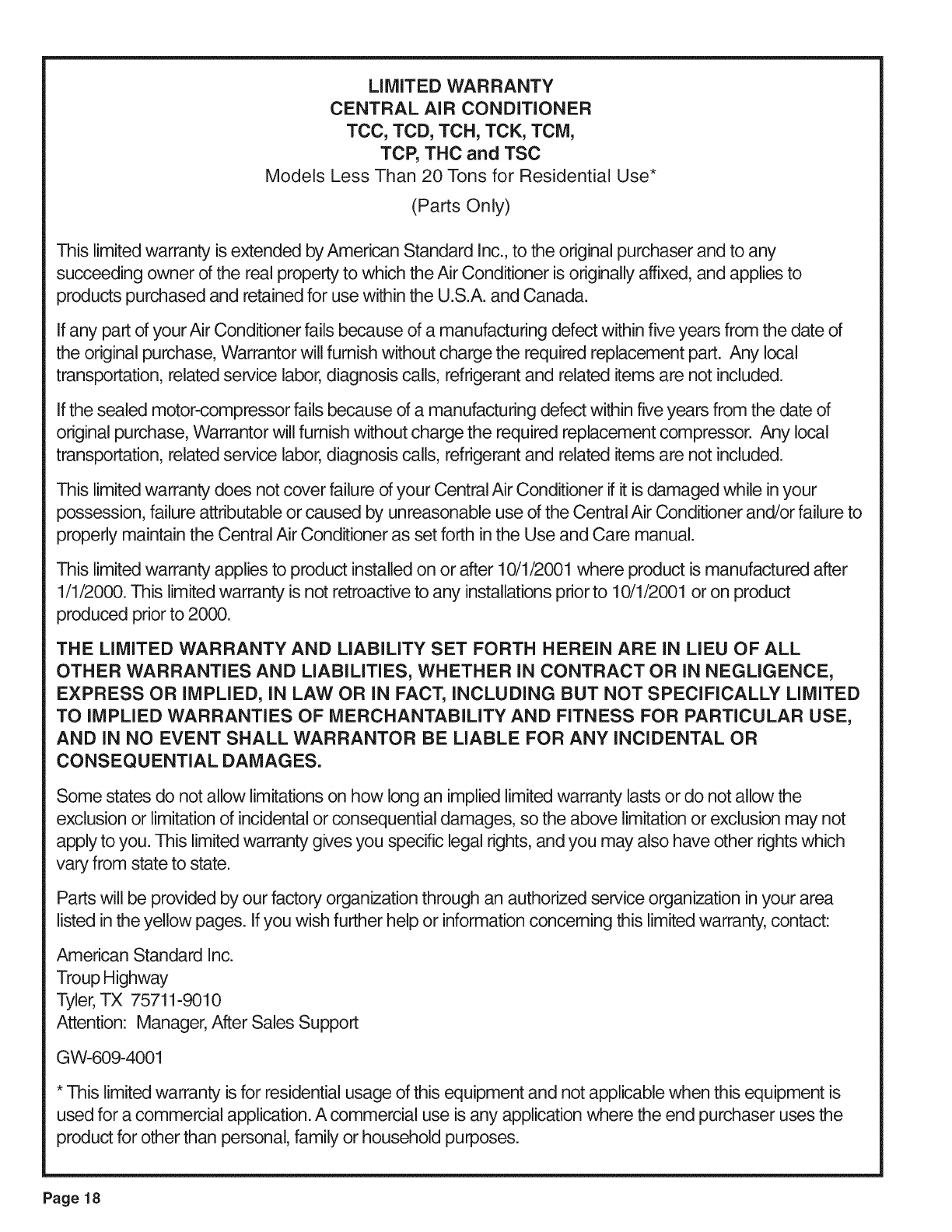 This limited warranty does not cover failure of your Central Air Conditioner if it is damaged while in your