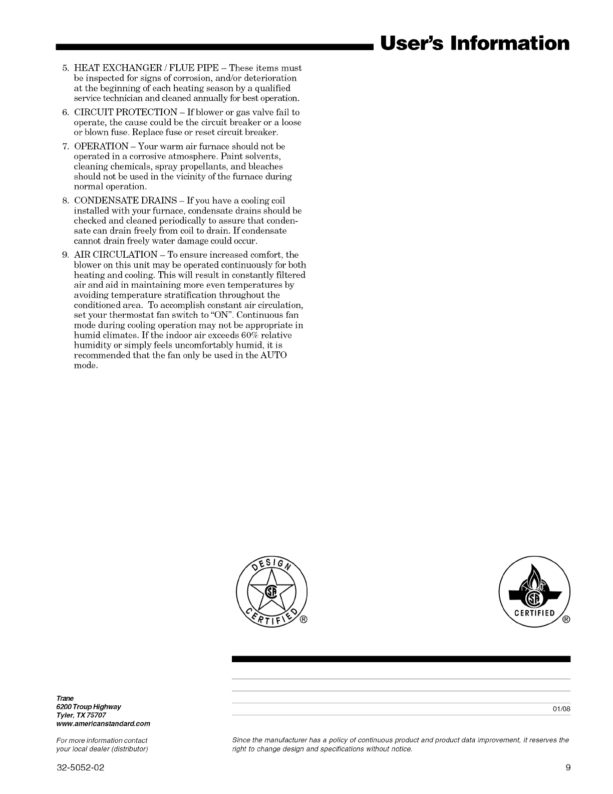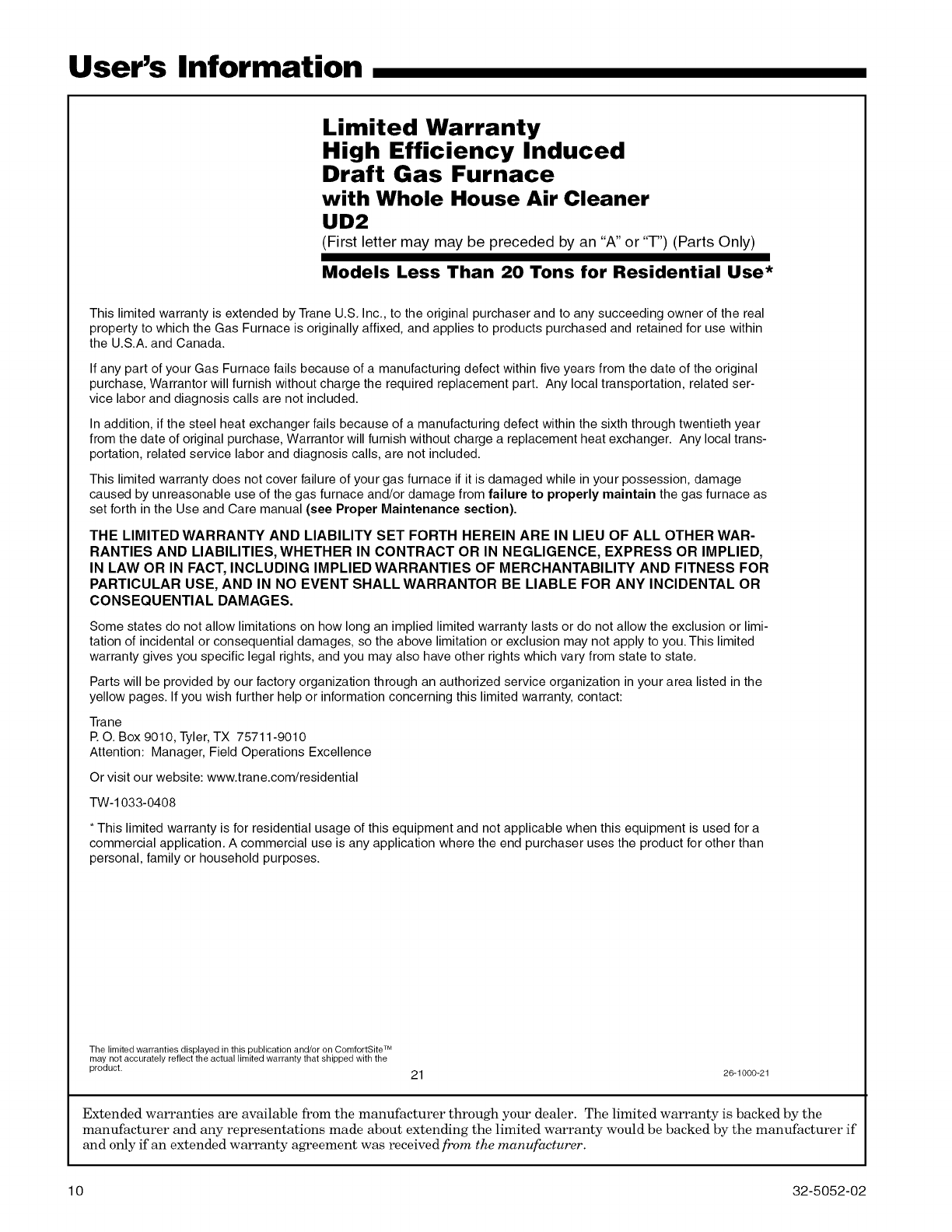 TRANE Furnace/Heater, Gas Manual L0905290