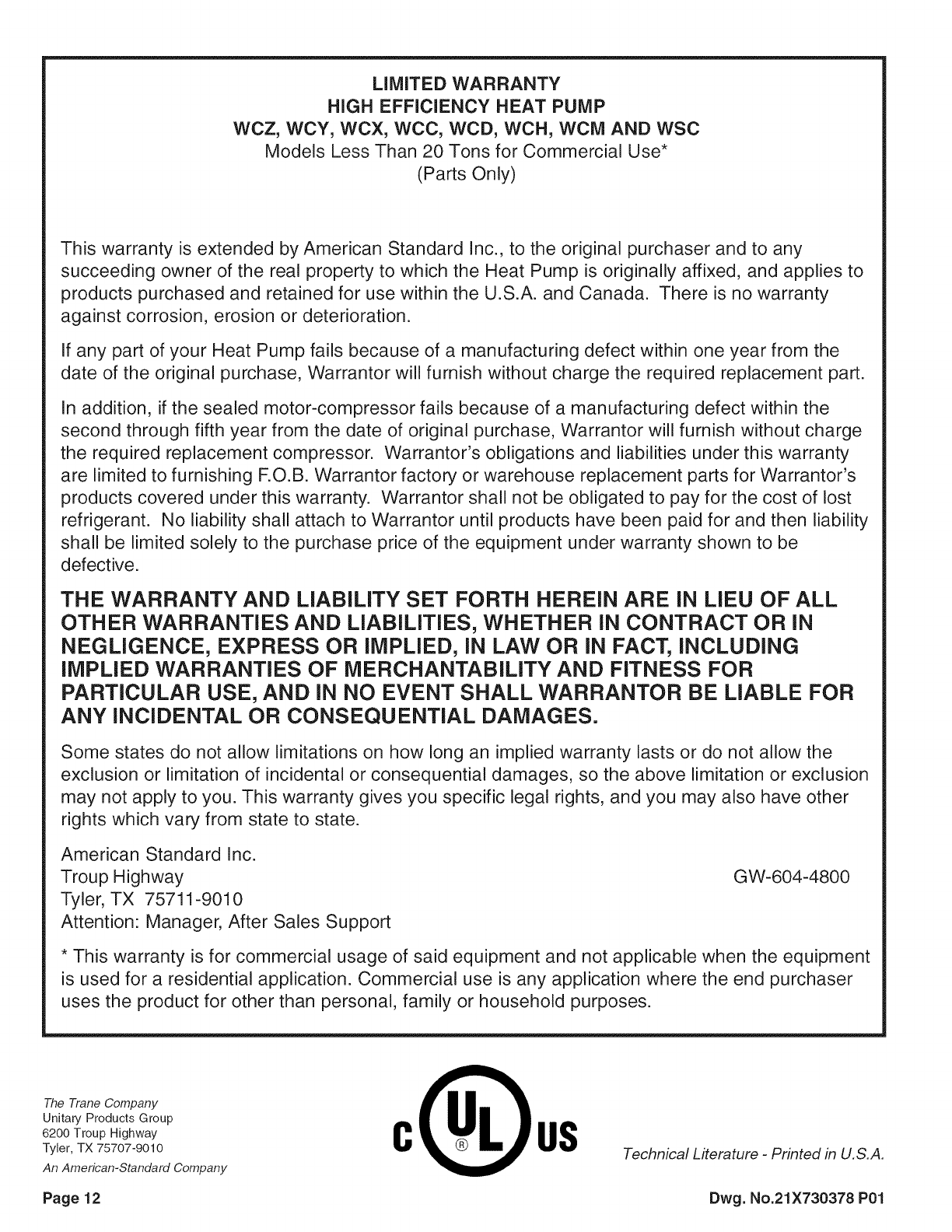 An American-Standard Company oQos Technical Lferature - Printed in U.S.A.