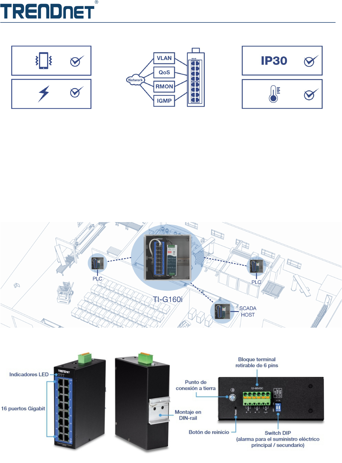 -40° a 75° C (-40° a 167° F) para entornos industriales. Sus controles de administración avanzada del tráfico, resolución de