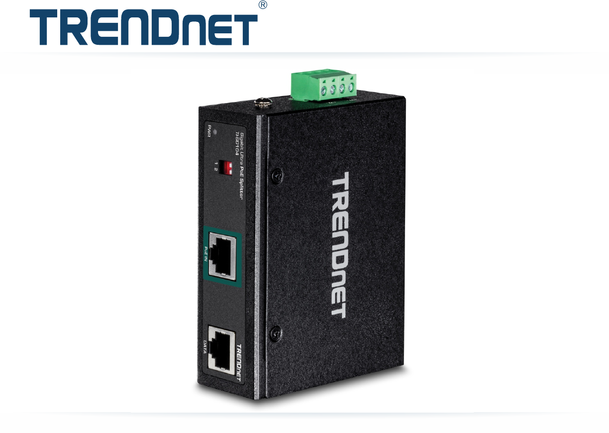 El Divisor industrial Gigabit UPoE de TRENDnet, modelo TI-SG104, conecta en red un dispositivo no PoE utilizando una conexión Gigabit Ultra PoE y