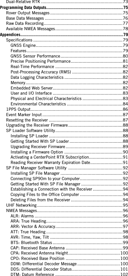 ![11http://www.spectraprecision.com/eng/sp90m.html#.WUkG_NxLep0USB driver for 64-bit OS: SpectraPrecisionUSBSerialSetup_x64.exe fileUSB driver for 32-bit OS: SpectraPrecisionUSBSerialSetup_x86.exe fileDouble-click on the downloaded file to install the driver.•[7]: Escape button. See Using the Front Panel Controls on page 26.•[8]: Bumpers (x2).Rear Panel•[8]: Bumpers (x2).•[9]: GNSS input #1. A TNC coaxial female connector allowing you to connect the first GNSS antenna to the receiver via a coaxial cable.•[10]: GNSS input #2. A TNC coaxial female connector allowing you to connect the second GNSS antenna to the receiver via a coaxial cable.•[11]: External GSM antenna (optional). A coaxial female connector (SMA type) allowing you to connect an external cellular antenna.The SP90m having a built-in GSM antenna, no external GSM antenna is usually required. In case of adverse reception conditions however (e.g. SP90m mounted in a rack), an external antenna can advantageously be used for better reception. Run the Web Server (Receiver> Network> Modem> Modem Antenna) to choose which of the internal or external antenna should be used.The SP90m uses a GSM antenna when it sends or receives RTK or differential corrections via its GSM modem.•[12]: UHF radio connector. A TNC coaxial female connector allowing you to connect a radio whip antenna. This connector is available only if the SP90m has been fitted with an internal radio.Warning! Do not confuse this coaxial connector with the GNSS inputs. Connecting a GNSS antenna to the UHF [9][13] [17][16][14] [15][10] [11] [12][8] [8]](https://usermanual.wiki/TRIMBLE-EUROPE/110610.Host-user-manual-1-SP90M-UG-B-Draft2-en-v1a-pdf/User-Guide-3573047-Page-19.png)